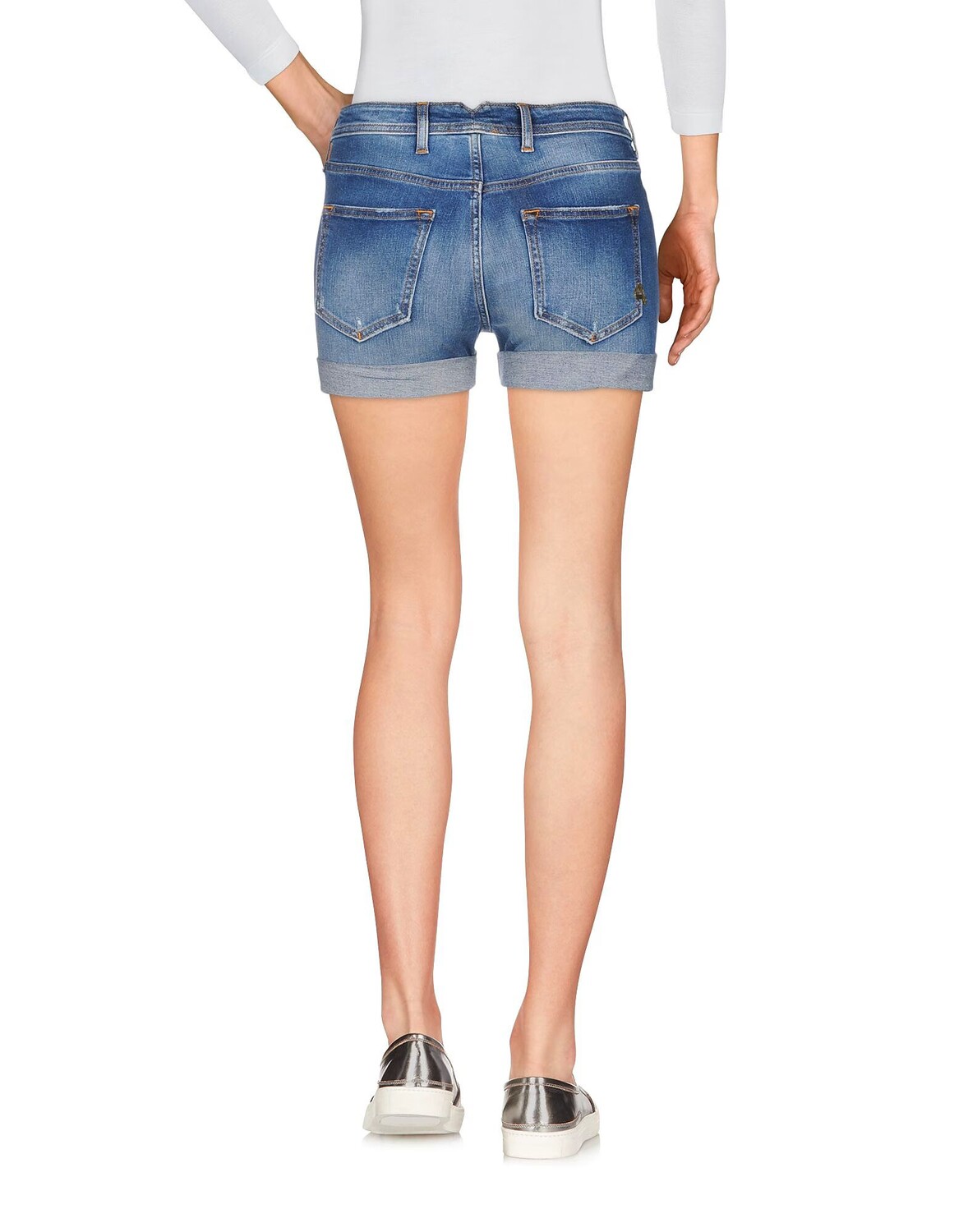 Джинсовая ткань, потертости, логотип бренда, одноцветное изделие, темный цвет, подвернутый подол, множество карманов, стрейч, шорты