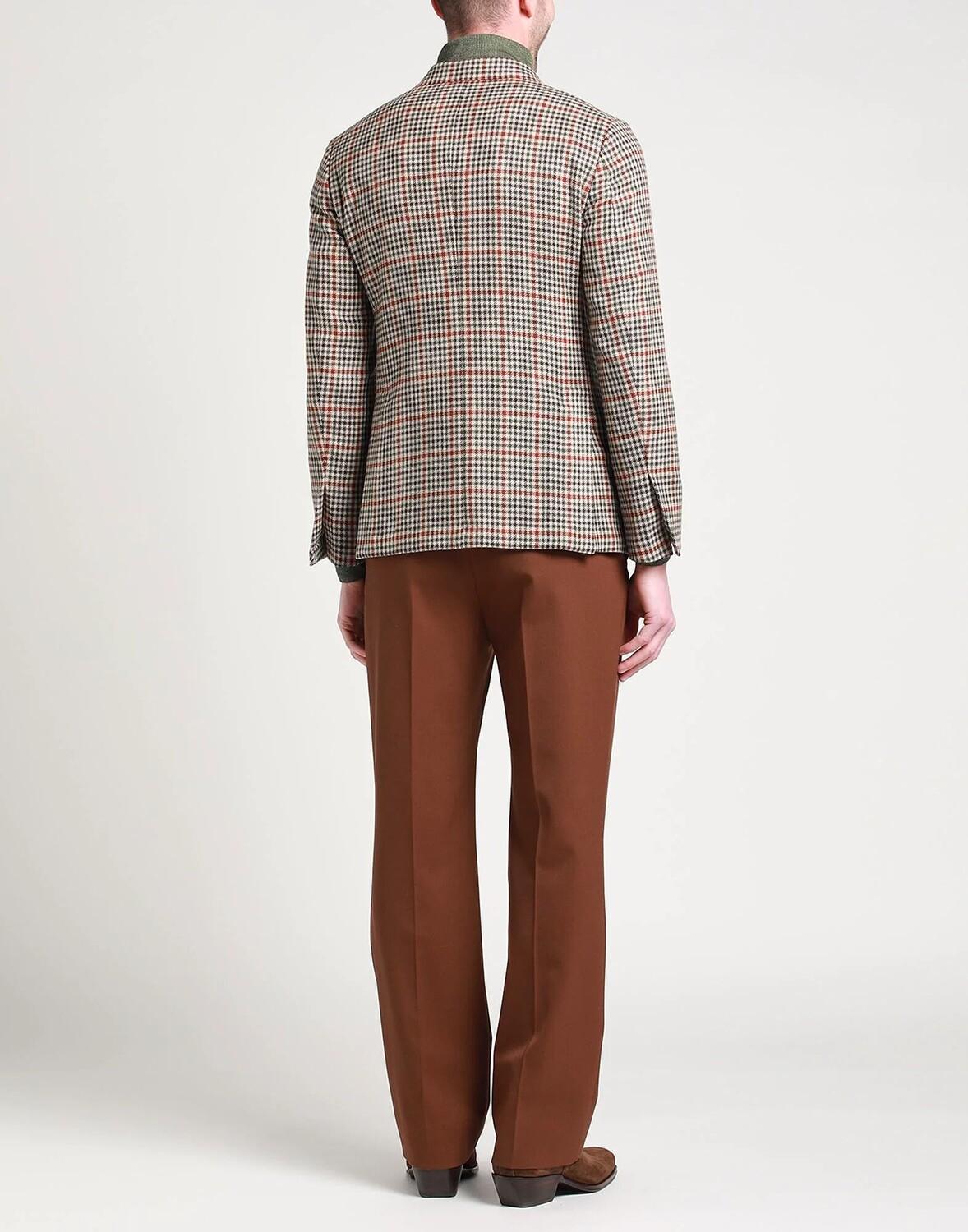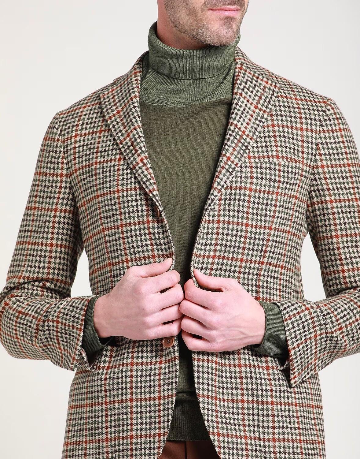 Фланель, без аппликаций, узор «гусиные лапки», воротник с лацканами, однобортный, длинные рукава, застежка на пуговицах, множество карманов, двойная шлица сзади, химчистка, не отбеливать, однобортный пиджак