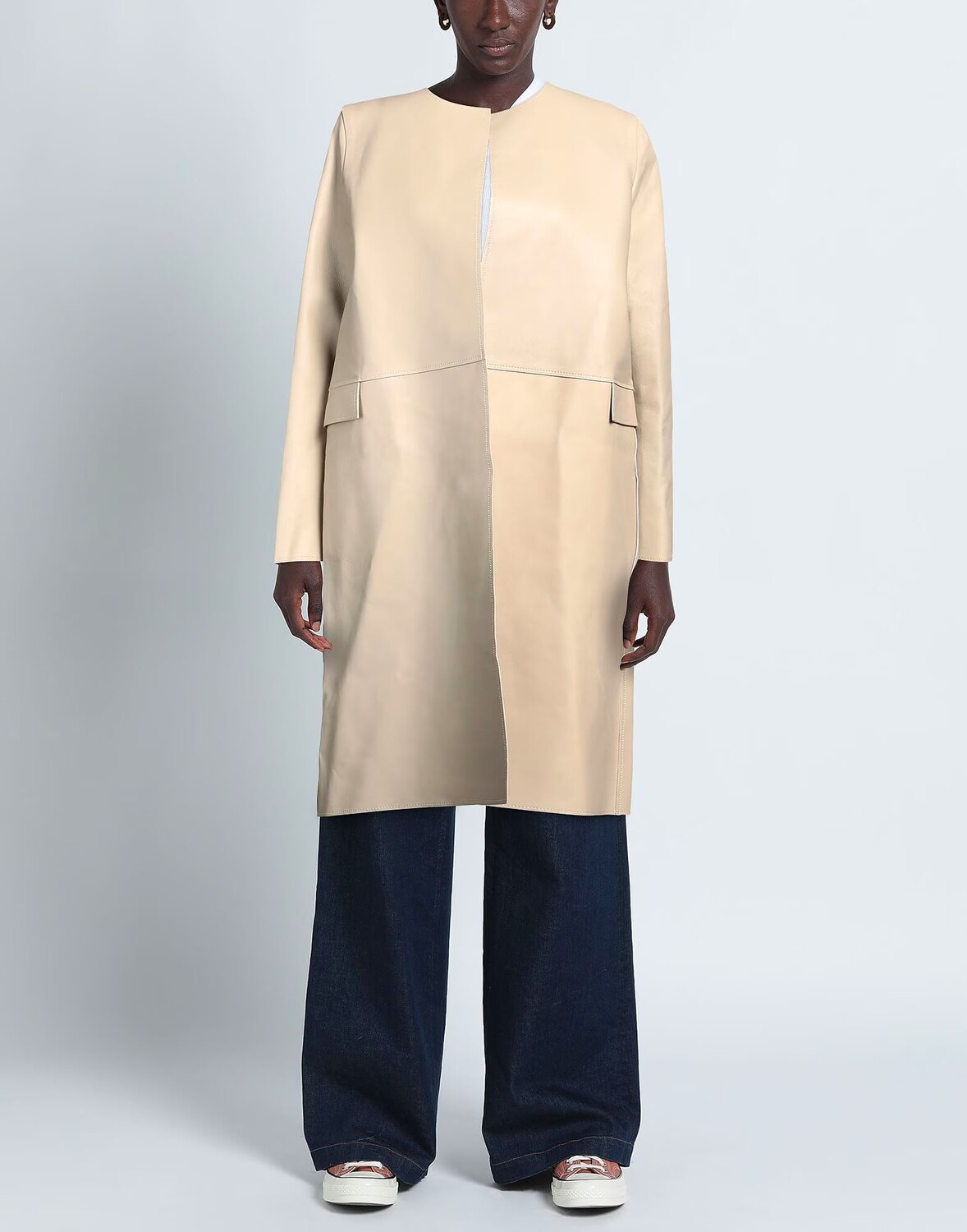Кожа, без аппликаций, одноцветное изделие, круглый вырез, длинные рукава, без подкладки, множество карманов, содержит нетекстильные части животного происхождения, не подвергать химчистке, не отбеливать, не сушить в стиральной машине, не гладить, однобортное пальто