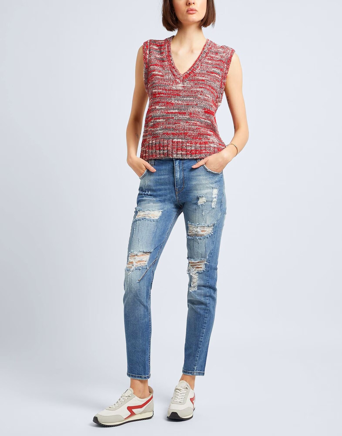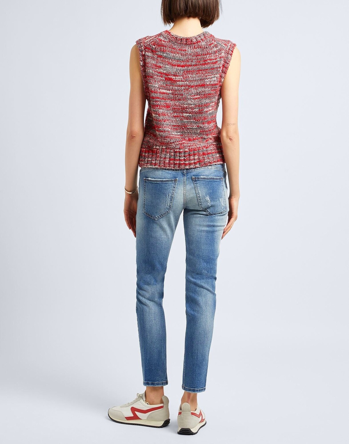 Джинсовая ткань, потертости, выцветший, логотип бренда, одноцветное изделие, средняя стирка, завышенная талия, стандартная посадка, 1 пуговица, застежка-молния, эластичный, машинная стирка, нельзя отбеливать, нельзя сушить в стиральной машине, джинсы-бойфренды
