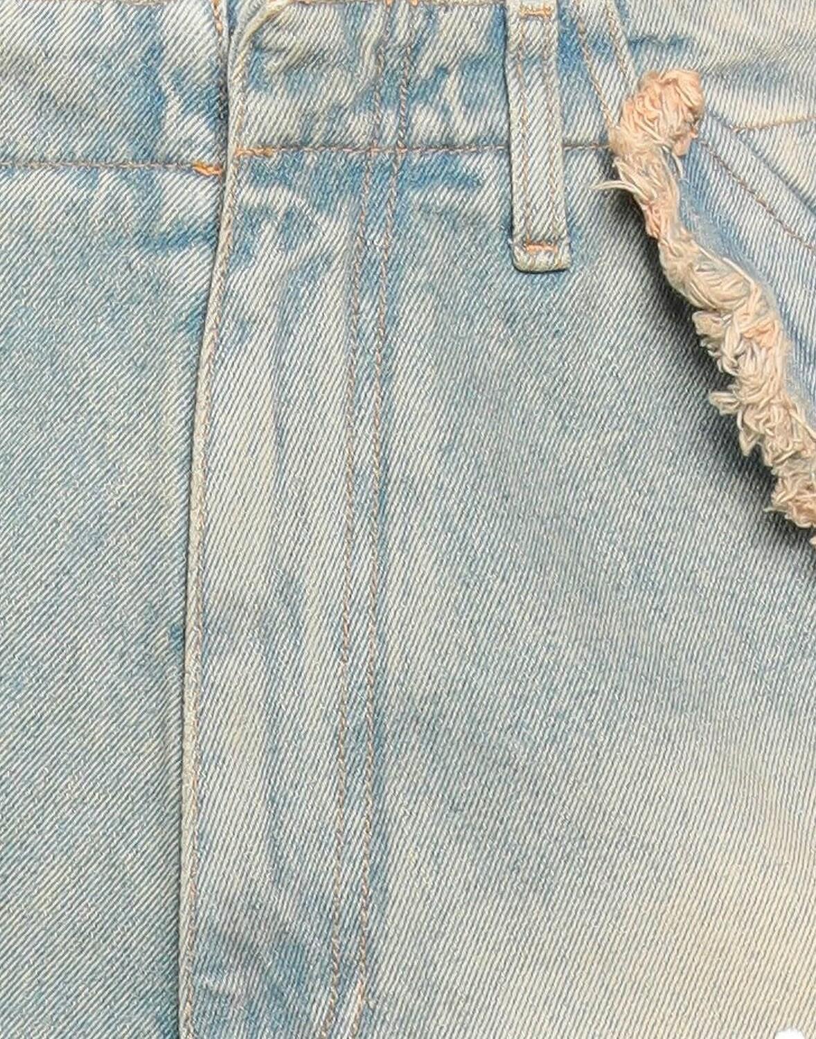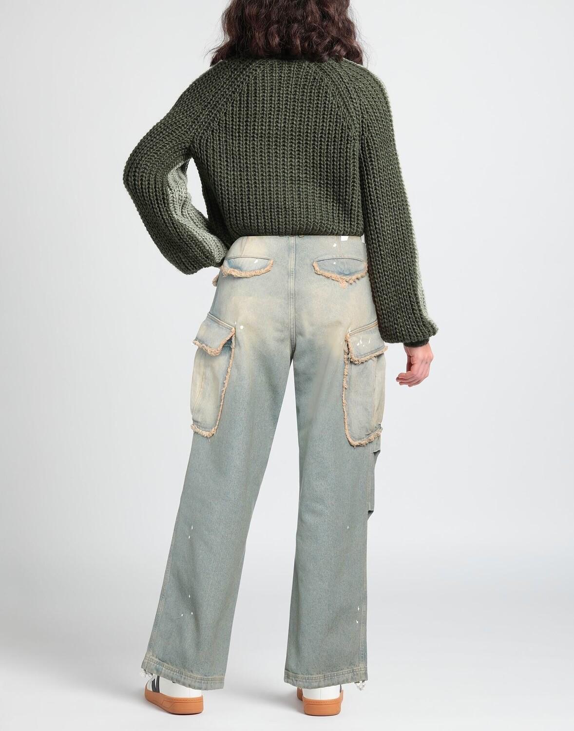Деним, выцветший, потертый, бахрома, одноцветный цвет, средняя стирка, высокая талия, свободный крой, застежки на крючки, застежка-молния, множество карманов, машинная стирка, нельзя отбеливать, нельзя сушить в стиральной машине, джинсы карго
