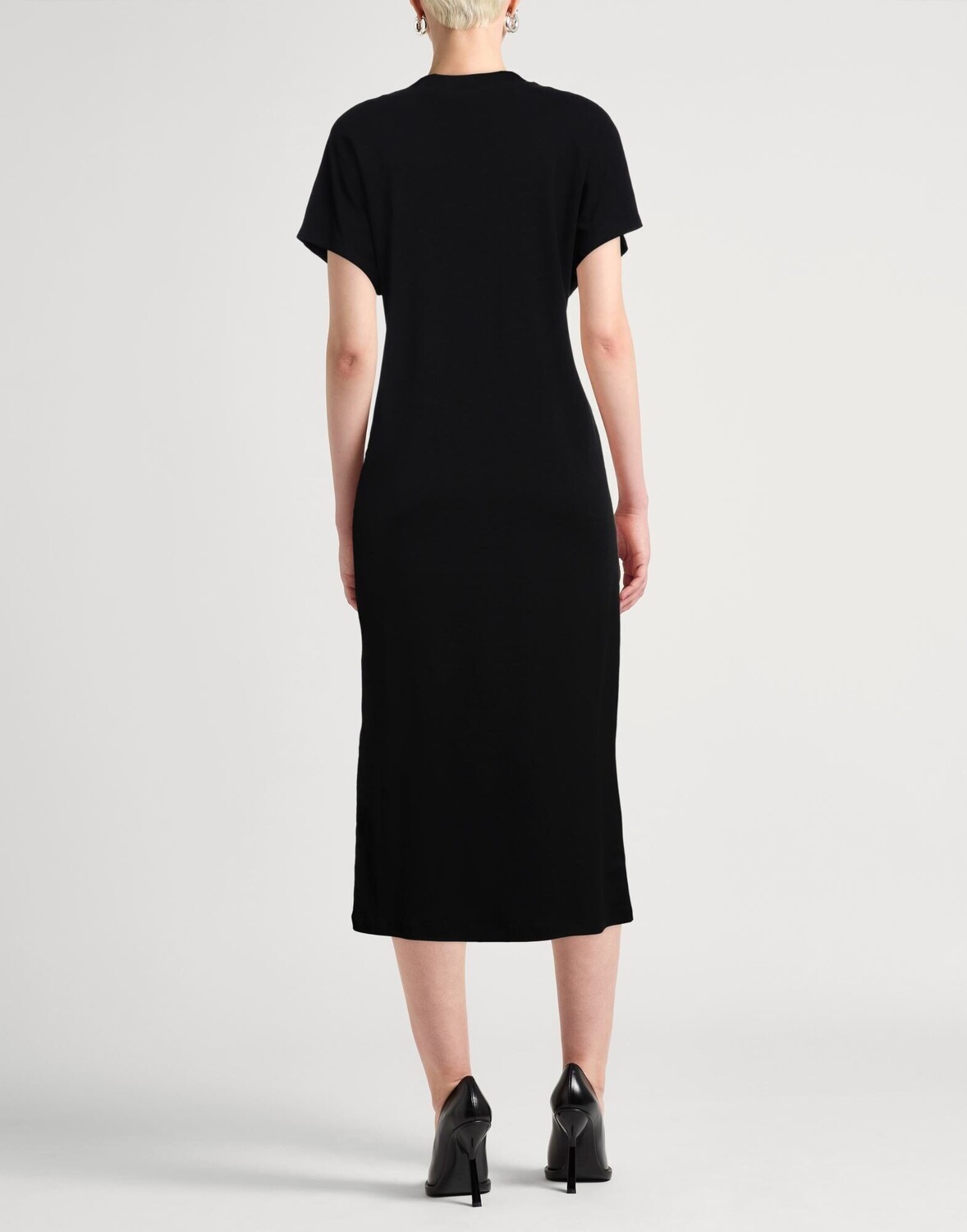 Платье-футболка, трикотаж, логотип бренда, полосы по боковым швам, одноцветное изделие с аппликациями, круглый вырез, короткие рукава, без подкладки, без карманов, машинная стирка, нельзя отбеливать, нельзя сушить в стиральной машине