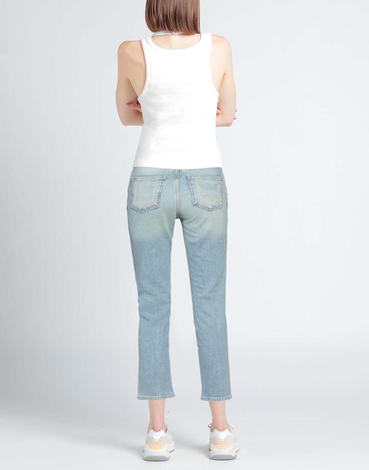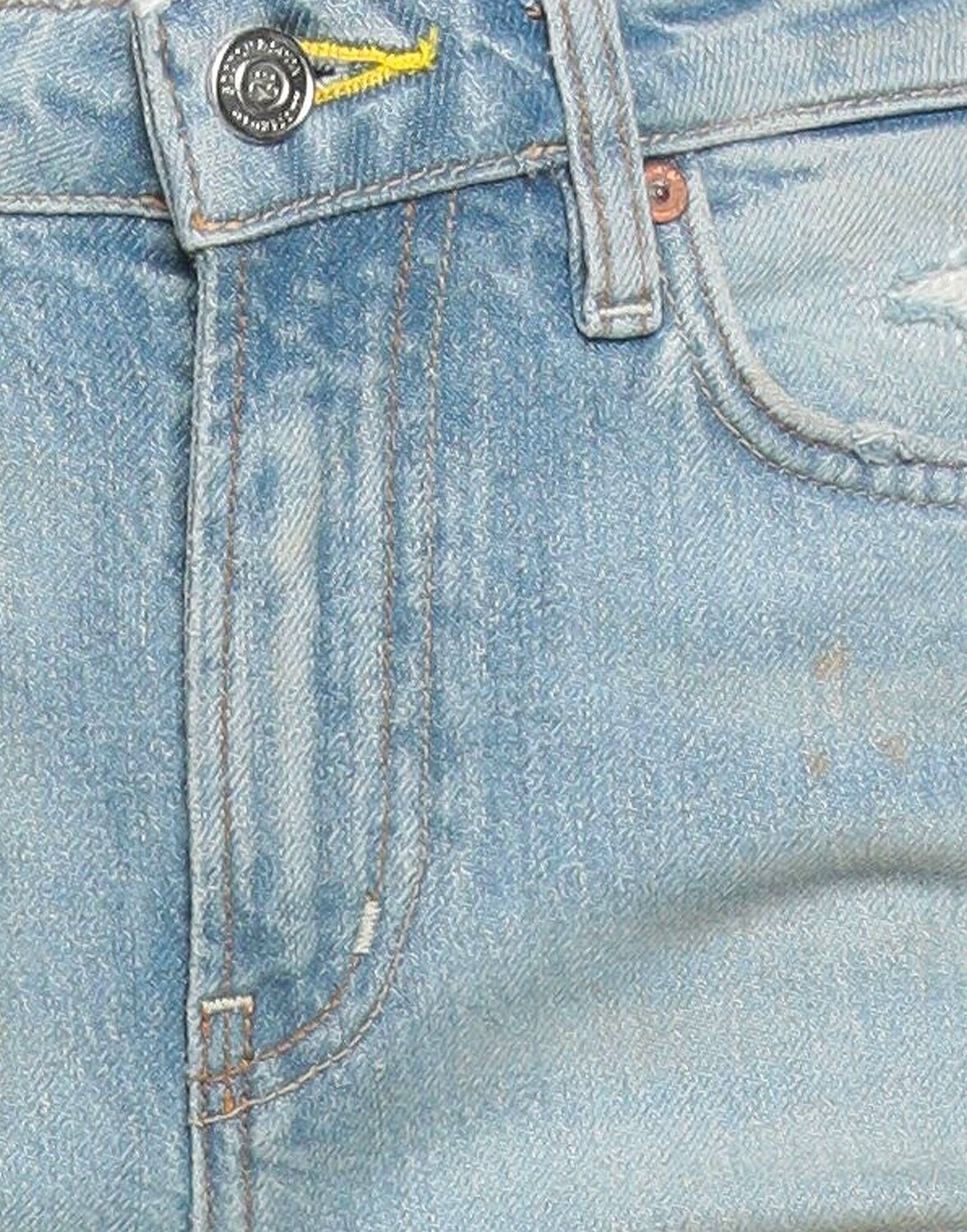 Деним, эффект потертости, эффект пятен, логотип бренда, кожаные аппликации, однотонный цвет, светлая стирка, средняя посадка, застежка-молния, 1 пуговица, пять карманов, содержит нетекстильные части животного происхождения, модель скинни