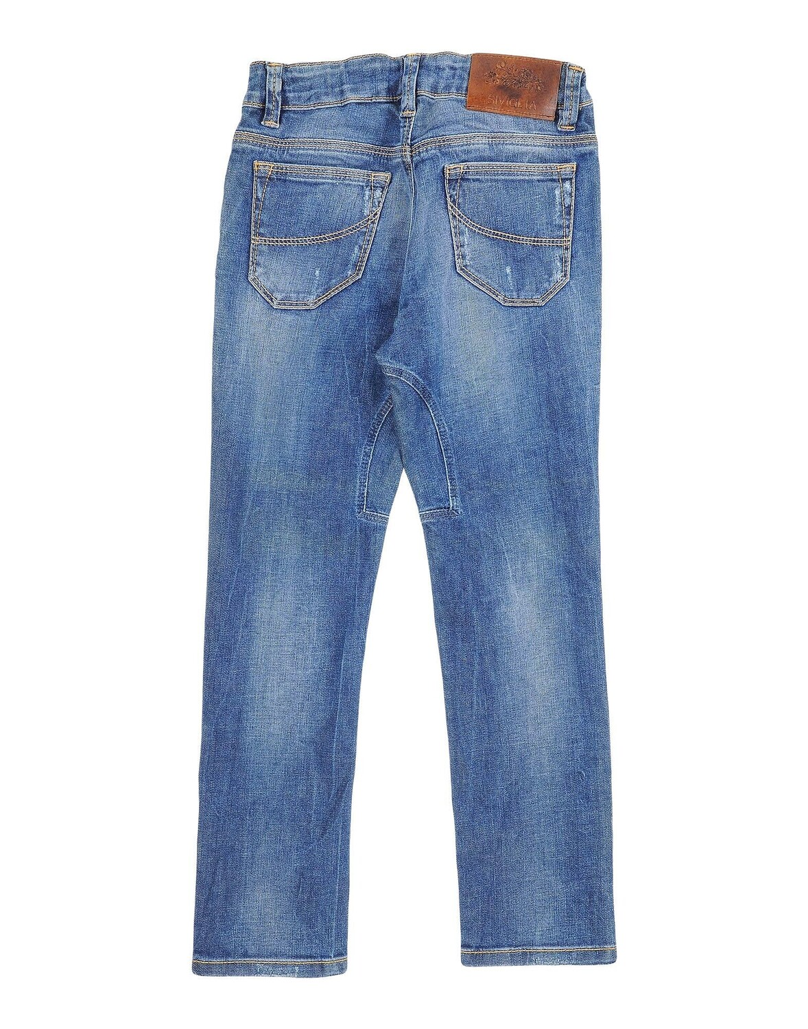 Джинсовая ткань, однотонный цвет, выцветший, средняя посадка, темная стирка, застежка спереди, пуговица, молния, множество карманов, логотип бренда, химическая чистка, гладить при температуре не выше 110°C, не отбеливать, стирать при 30°C, нельзя сушить в стиральной машине, прямые джинсы, эта марка маломерит