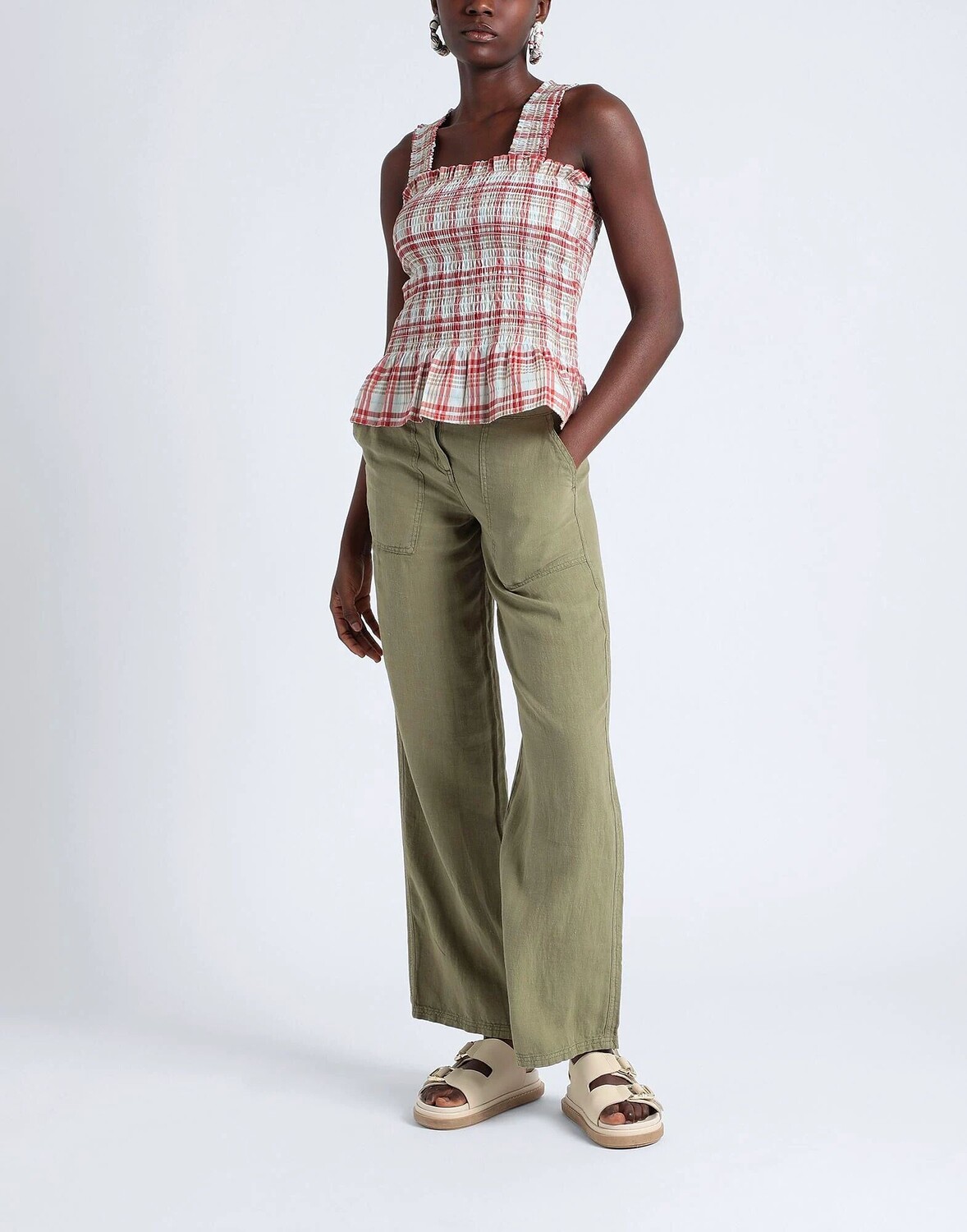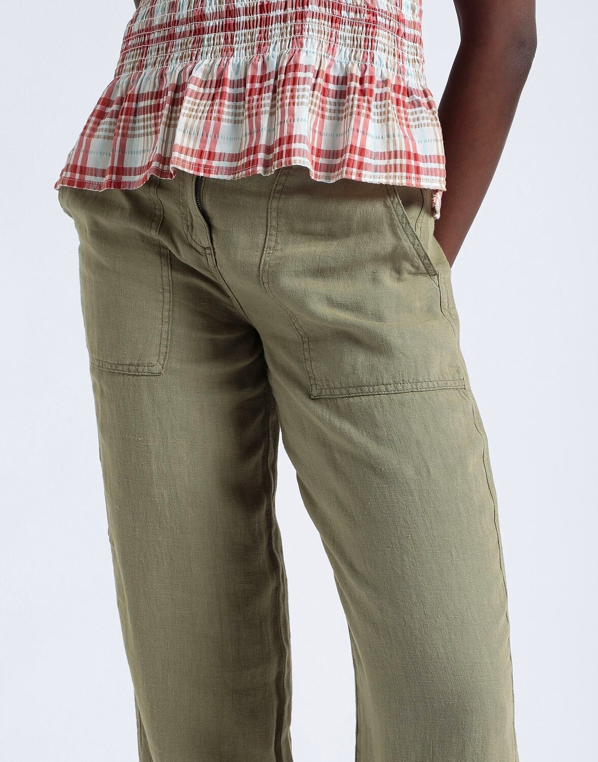 Полотняное переплетение, без аппликаций, одноцветное изделие, завышенная талия, прямые брючины, стандартный крой, застежка на крючки, застежка-молния, множество карманов, брюки