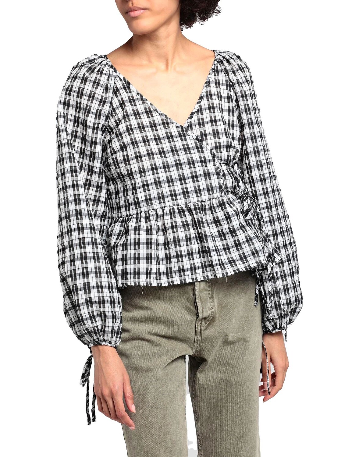 Полотняное плетение, кружево, оборки, клетка, глубокий вырез, длинные рукава, завязка, без карманов