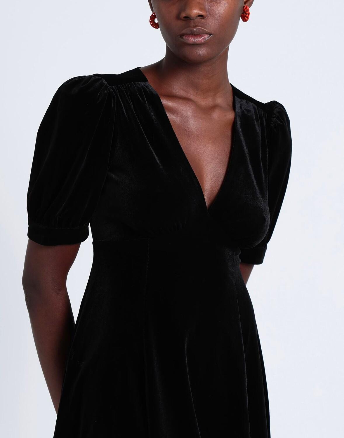 Бархат, оборки, однотонное изделие, v-образный вырез, короткие рукава, без подкладки, стрейч, фасон трапеция