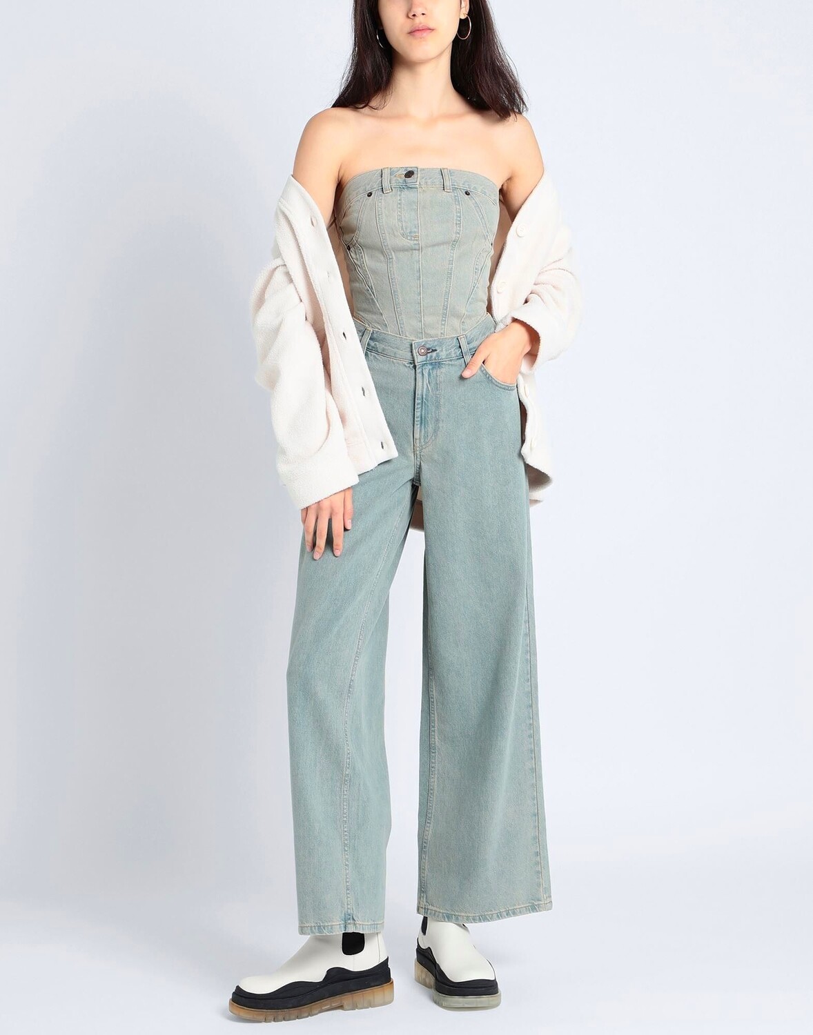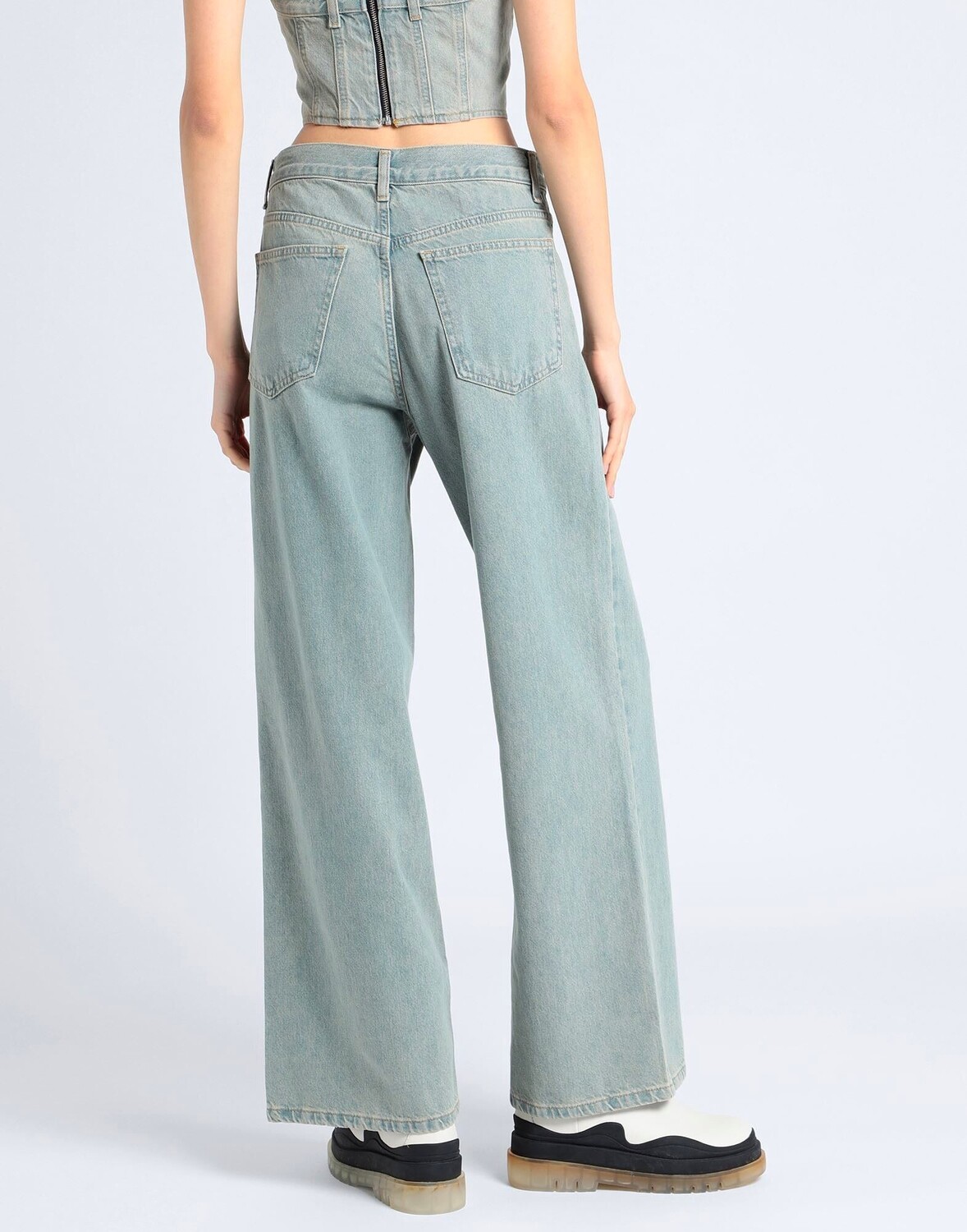 Деним, выцветший, без аппликаций, одноцветное изделие, средняя степень стирки, завышенная талия, шлевки для ремня, прямые брючины, стандартный крой, застежка-молния, 1 пуговица, пять карманов, модель прямого кроя