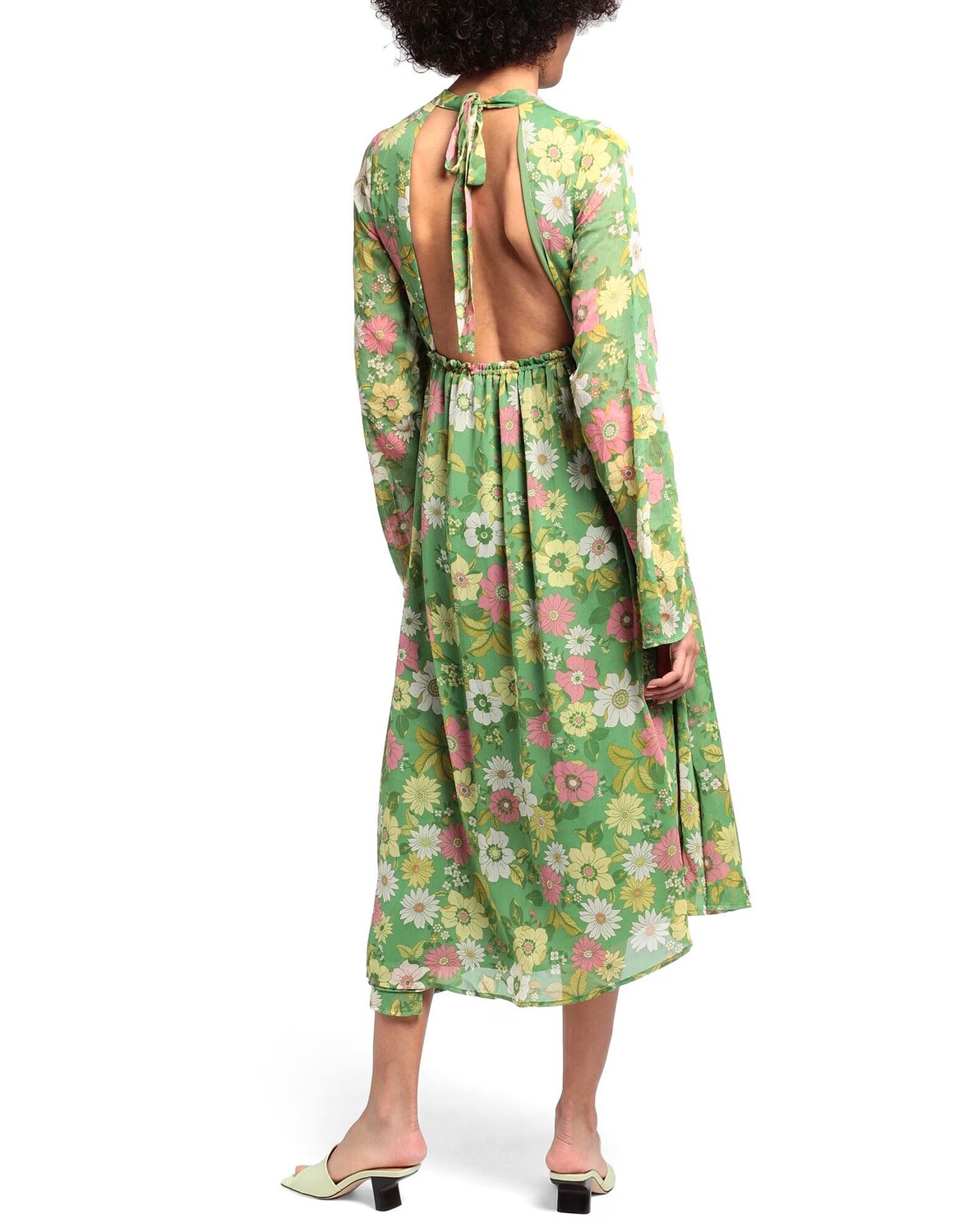 Креп, оборки, цветочный дизайн, круглый воротник, длинные рукава, полностью на подкладке, застежка на кулиске, завязка на завязках, асимметричный подол