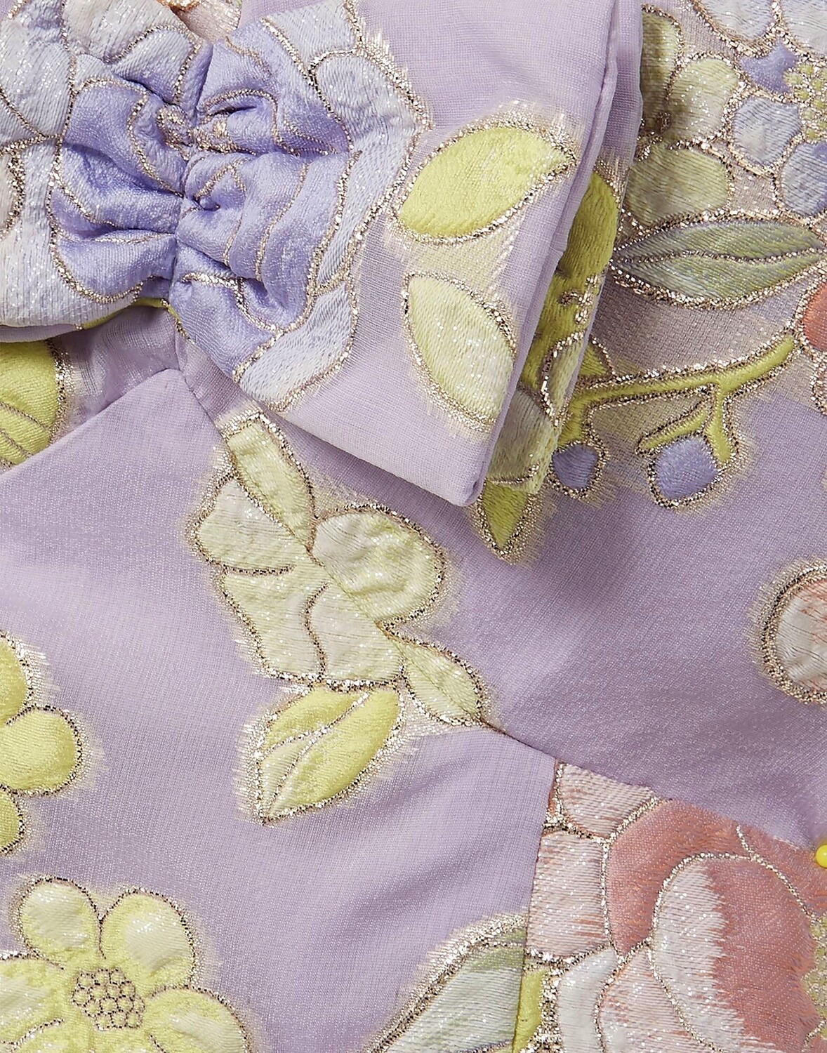 Органза, жаккард, ламе, бант, цветочный принт, глубокий вырез, короткие рукава, рукава-буфы, внутри на подкладке, застежка-молния, без карманов, верх
