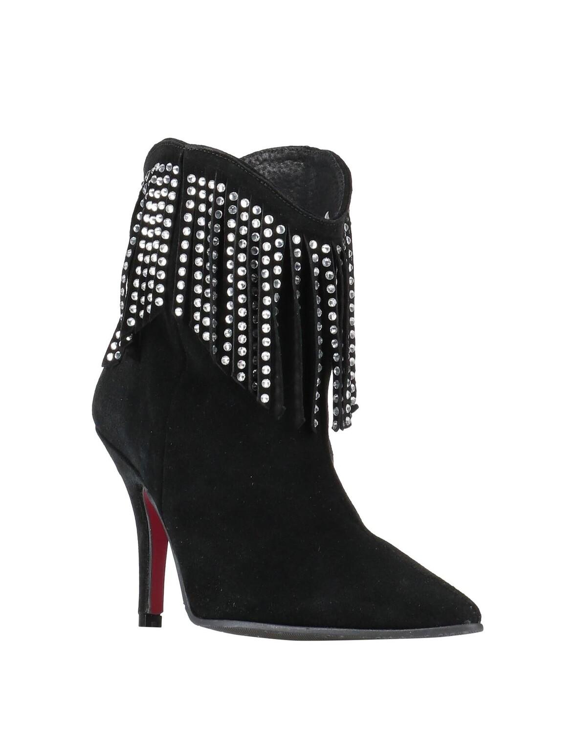 Кожа, эффект замши, стразы, бахрома, одноцветное изделие с аппликациями, подкладка из кожи, узкий носок, каблук-щипок, обтянутый каблук, резиновая подошва, содержит нетекстильные части животного происхождения, ботильоны замшевые