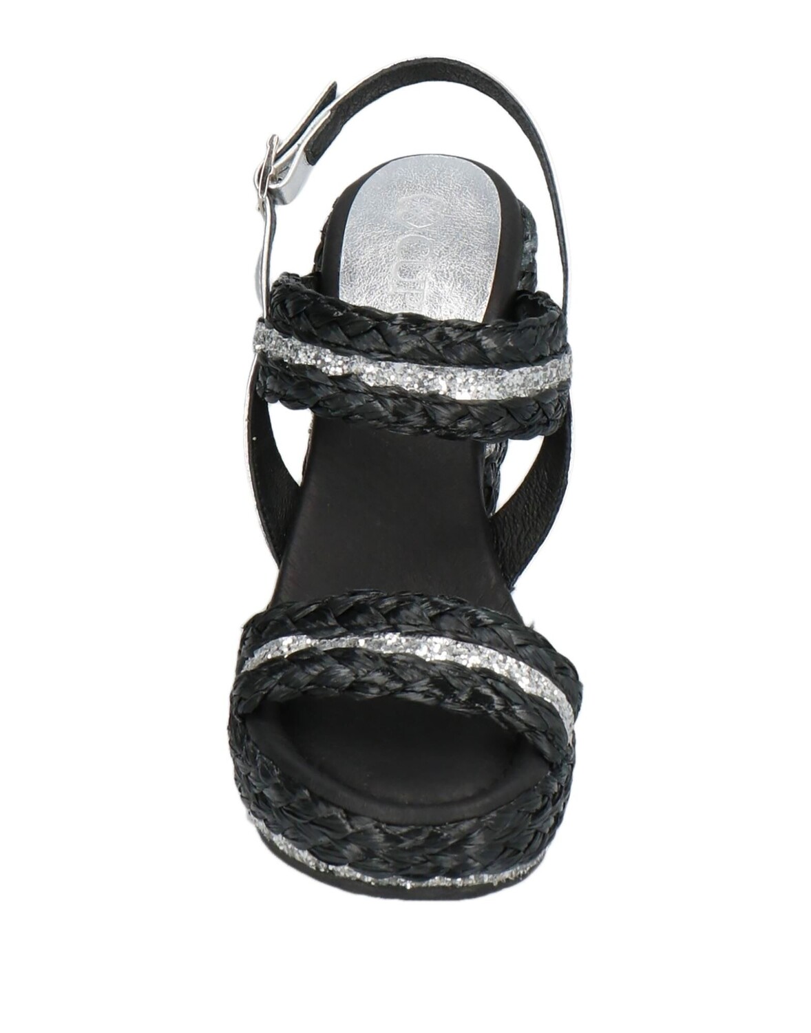 Эффект ламинирования, блестки, одноцветное изделие с аппликациями, подкладка из кожи, застежка-пряжка, скругленный носок, каблук-танкетка, резиновая рифленая подошва, содержит нетекстильные части животного происхождения, сандалии-эспадрилья
