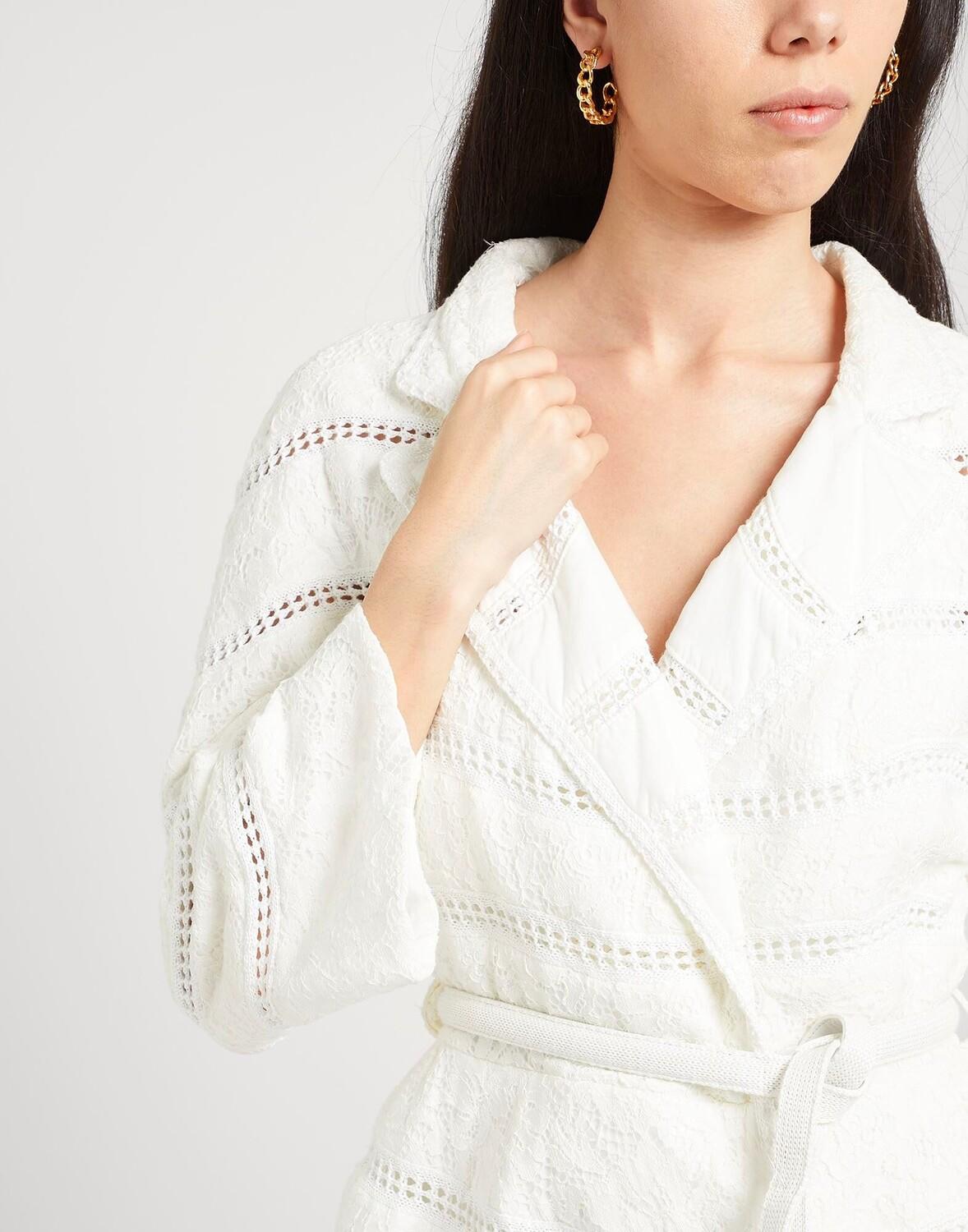 Кружево, пояс, одноцветное изделие, воротник с лацканами, двубортный, длинные рукава, кнопки, без карманов, содержит нетекстильные части животного происхождения, химчистка, нельзя сушить в стиральной машине, не отбеливать, двубортный пиджак