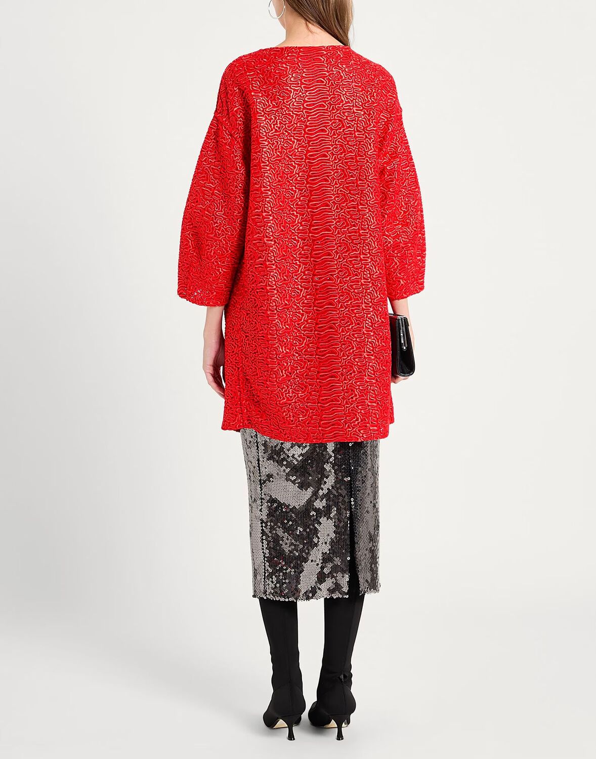 Кружево, кристаллы, вышивка, одноцветное изделие с аппликациями, круглый вырез, однобортный, рукава 3/4, без подкладки, застежки-пуговицы, кнопки, множество карманов, химчистка, нельзя отбеливать, нельзя сушить в стиральной машине, пальто