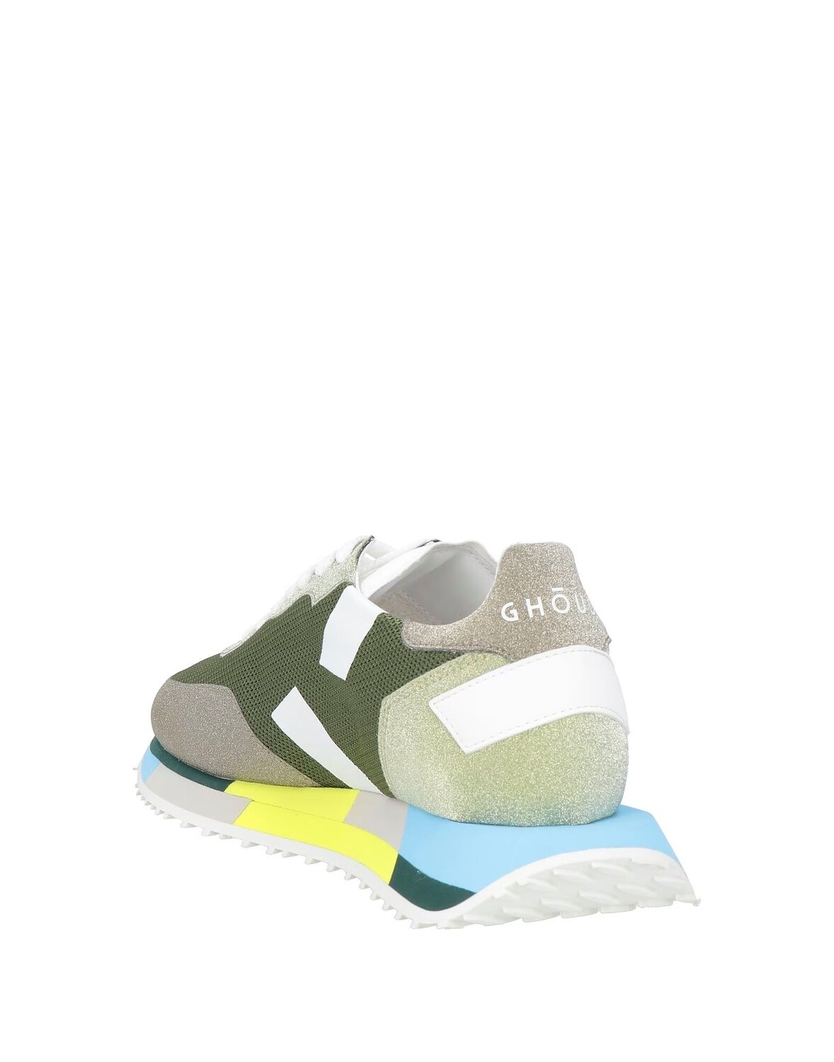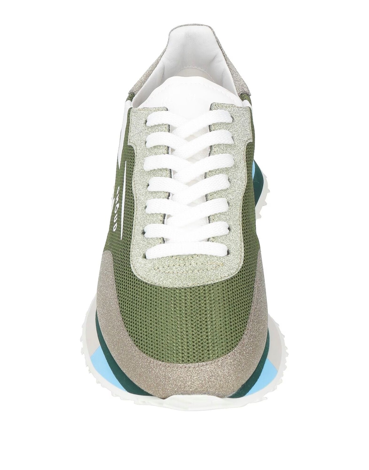 Техническая ткань, эффект покрытия, логотип бренда, блестки, разноцветный узор, кожаная подкладка, шнуровка, скругленный носок, плоская подошва с резиновым тиснением, низкие кеды и кроссовки
