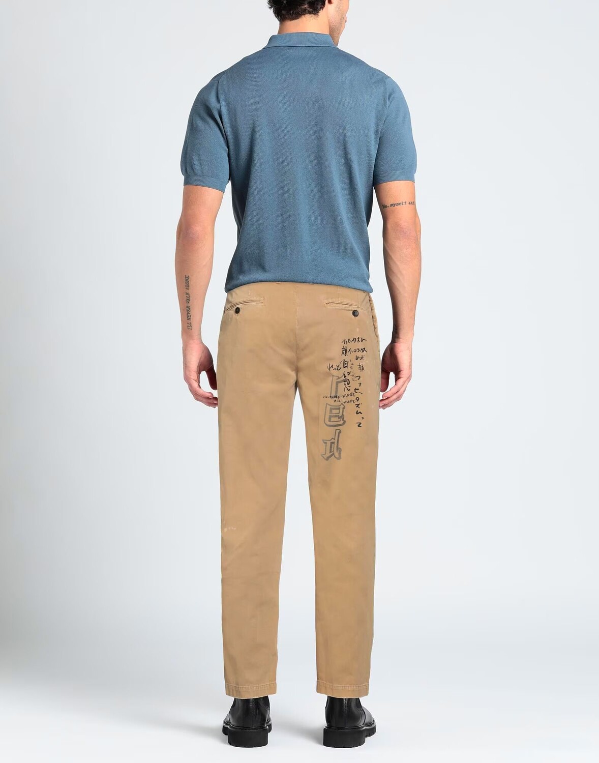Полотняное переплетение, эффект морилки, логотип бренда, одноцветное изделие с принтом, средняя посадка, прямые брючины, классический крой, застежка-молния, 1 пуговица, несколько карманов, карман на пуговицах, брюки