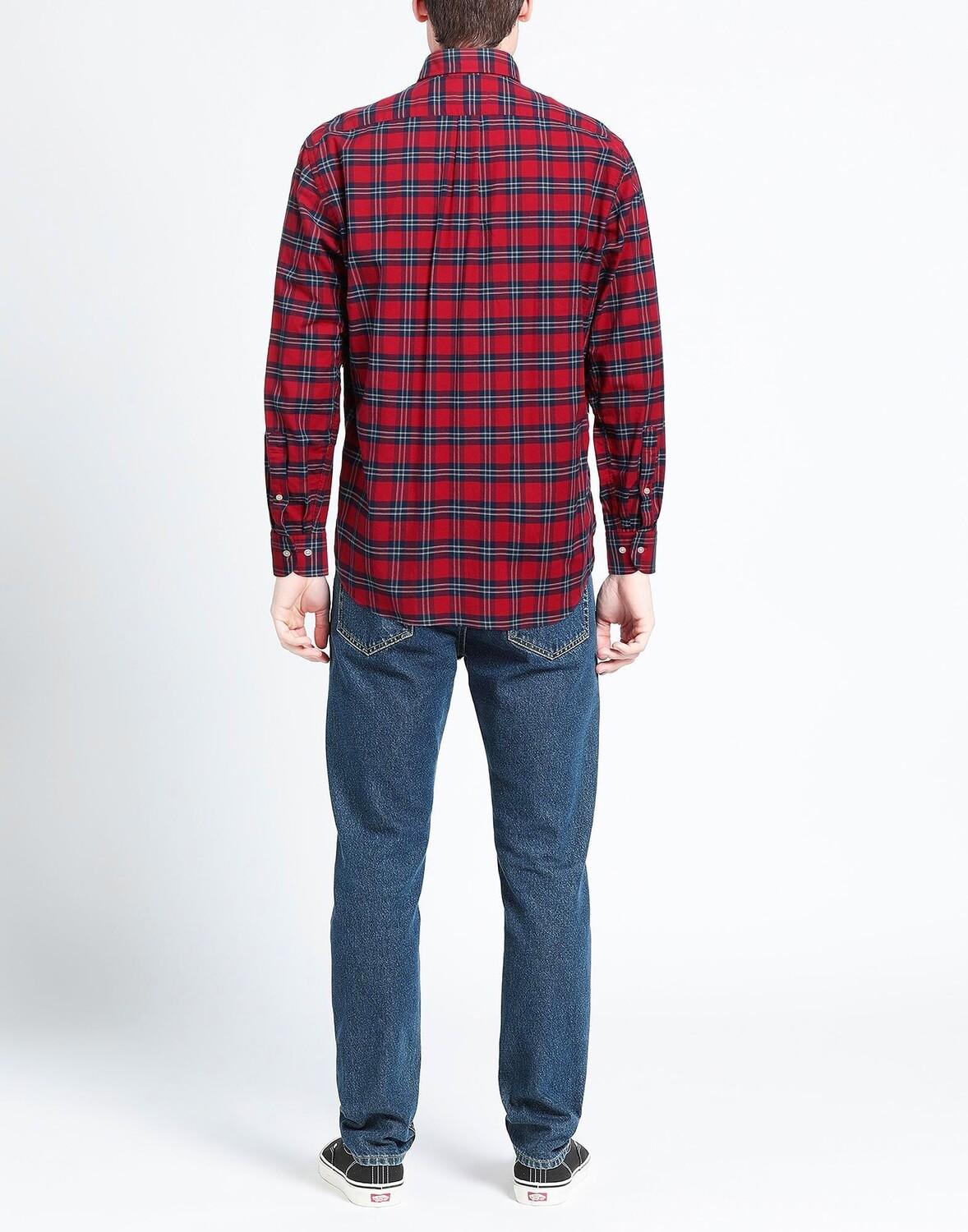 Полотняное переплетение, логотип бренда, узор в клетку «тартан», разноцветный узор, воротник на пуговицах, длинные рукава, манжеты на пуговицах, пуговицы, без карманов