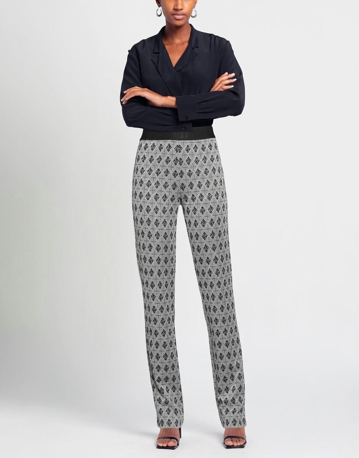 Трикотаж, металлик, легкий трикотаж, без аппликаций, логотип, завышенная талия, приталенный крой, машинная стирка, нельзя отбеливать, нельзя сушить в стиральной машине, брюки этой марки небольшого размера, прямые брюки