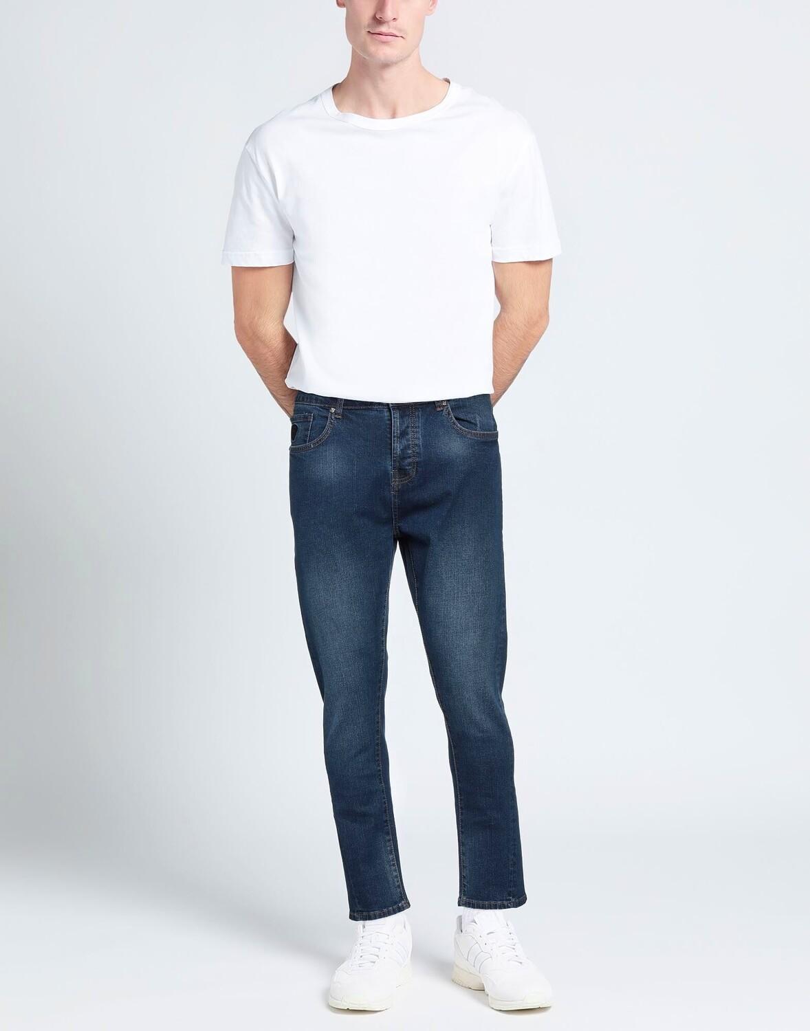 Деним, выцветший, логотип бренда, одноцветное изделие, темный цвет, средняя посадка, зауженные брючины, стандартный крой, без подкладки, пуговицы, пять карманов, стрейч, модель прямого кроя