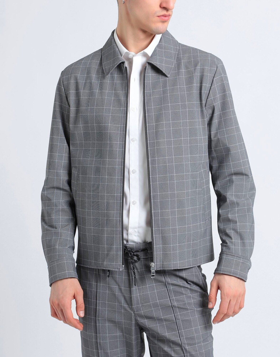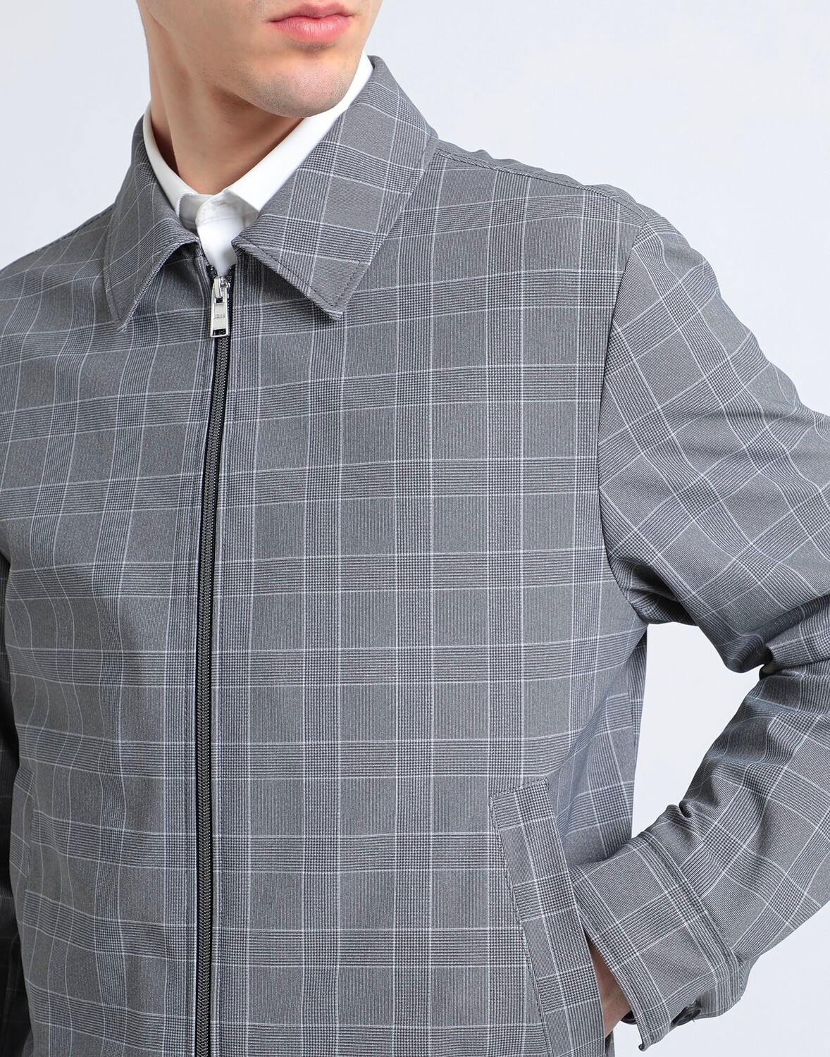 Креп, без аппликаций, клетчатая клетка, классический воротник, однобортный, длинные рукава, манжеты на пуговицах, внутри на подкладке, застежка-молния, множество карманов, стрейч, верхняя одежда общего назначения