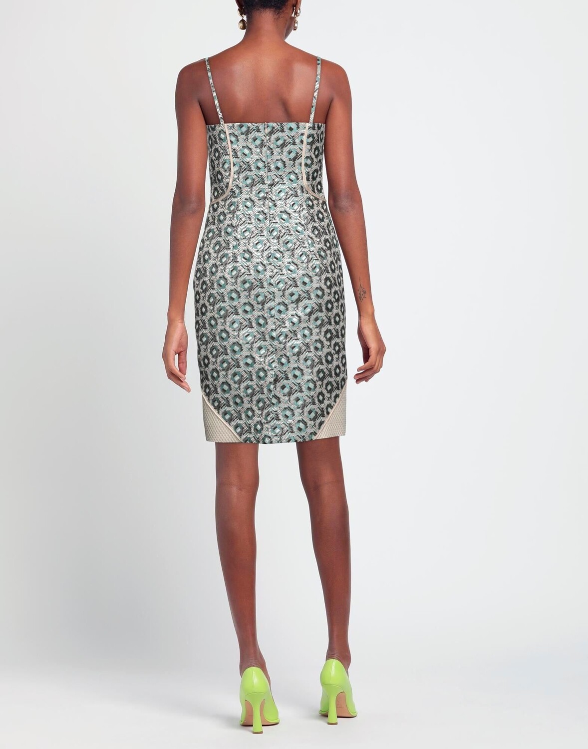 Полотняное переплетение, жаккард, ламе, пайетки, разноцветный узор, глубокий вырез, без рукавов, внутри на подкладке, застежка-молния, без карманов, фасон-карандаш