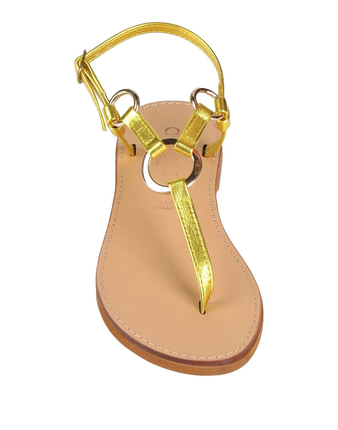 Кожа, металлик, металлические аппликации, одноцветное изделие с аппликациями, подкладка из кожи, закругленный носок, плоская поверхность, резиновая подошва, содержит нетекстильные части животного происхождения, босоножки с ремешком на щиколотке