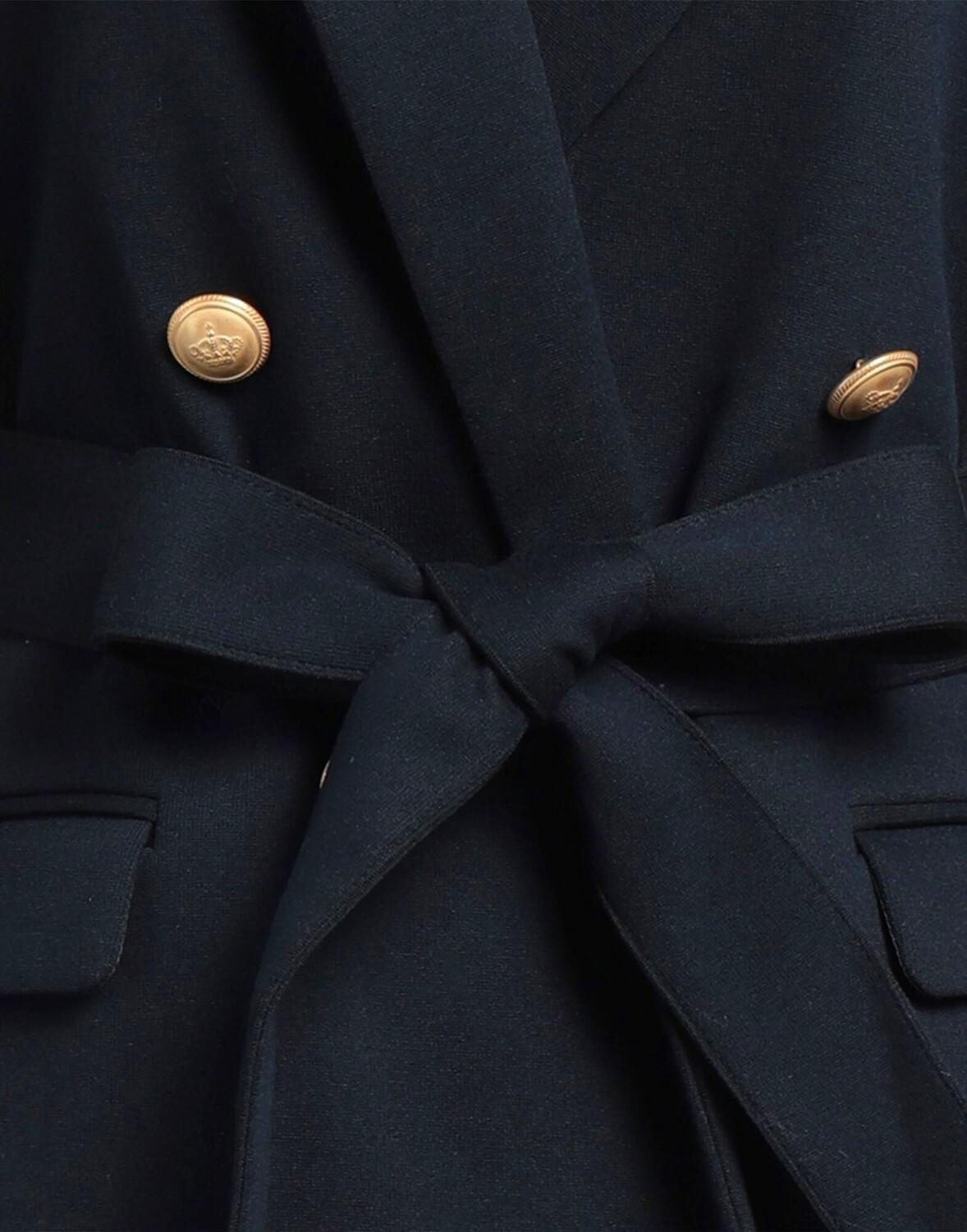 Трикотаж, ремень, одноцветное изделие, воротник с лацканами, двубортный, длинные рукава, манжеты на пуговицах, застежка на пуговицы, множество карманов, двубортный пиджак
