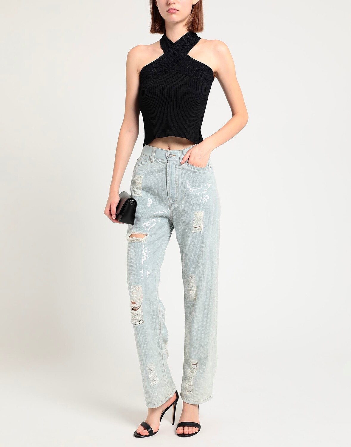 Джинсовая ткань, потертости, пайетки, одноцветное изделие, легкая стирка, высокая талия, стандартный крой, застежка на пуговицы, множество карманов, ручная стирка, нельзя отбеливать, нельзя сушить в стиральной машине, содержит нетекстильные части животного происхождения, джинсы прямого кроя