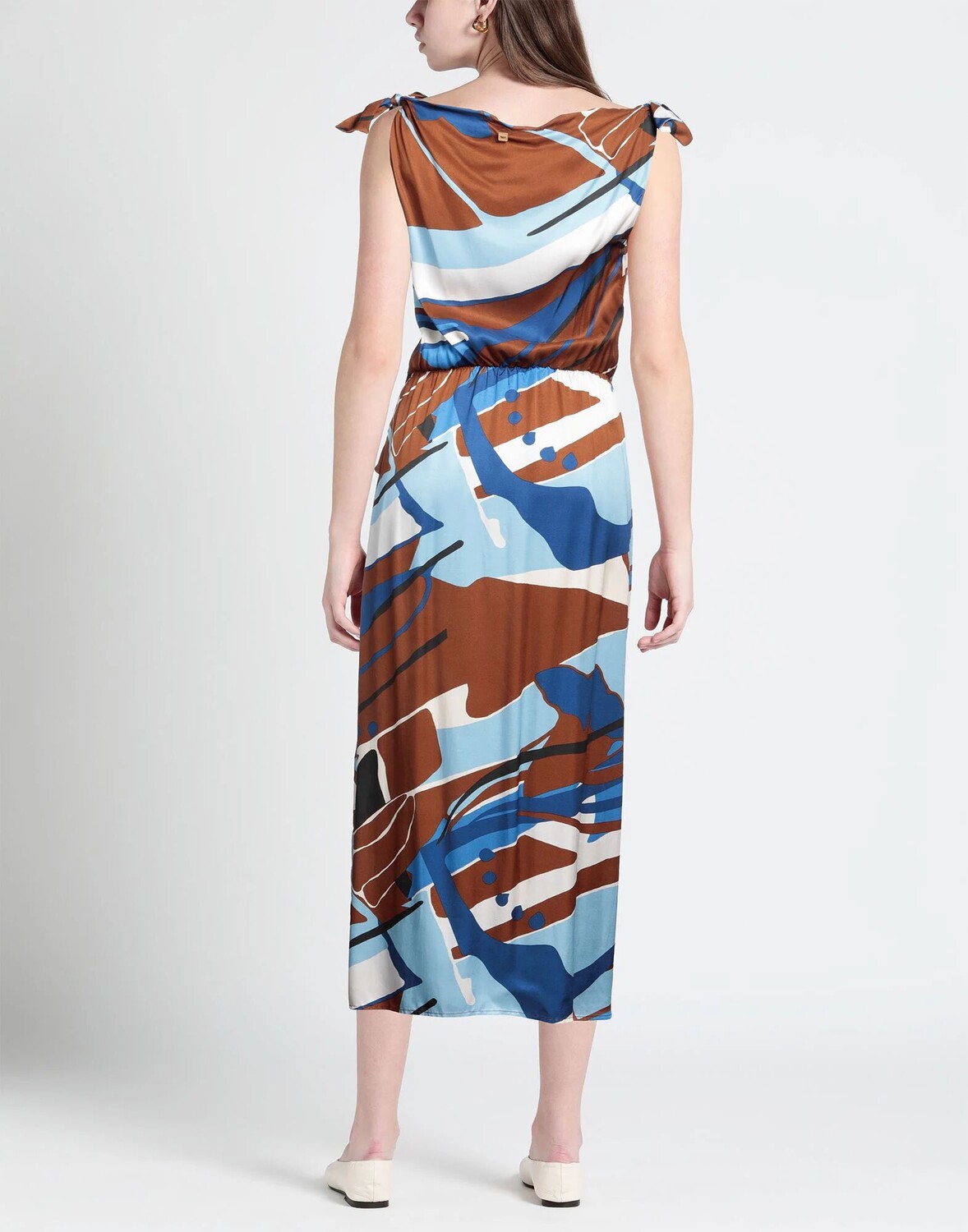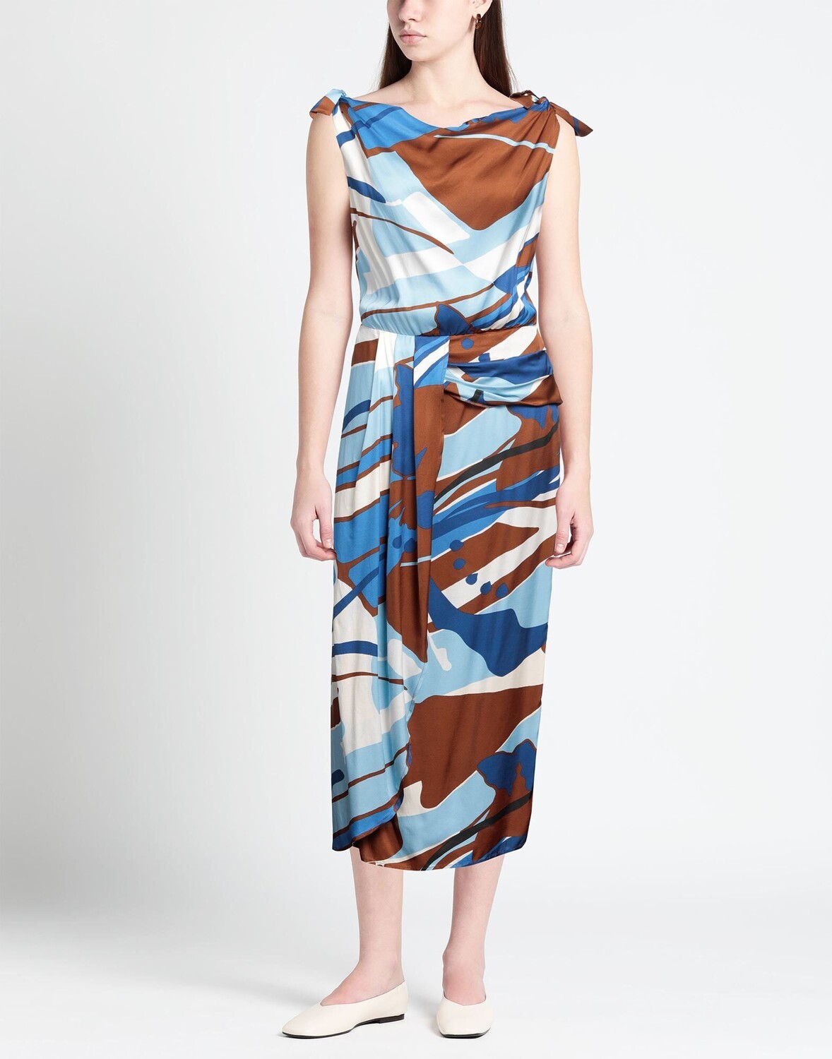 Атлас, без аппликаций, разноцветный узор, воротник с драпировкой, без рукавов, без подкладки, без карманов, платье