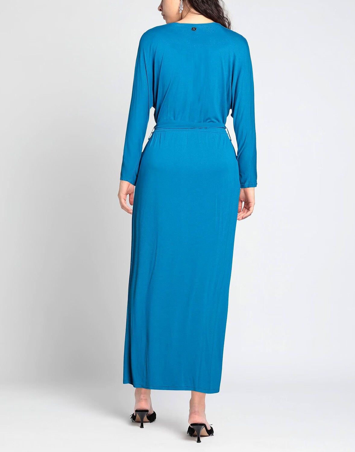 Джерси, пояс, одноцветное изделие, глубокий вырез, длинные рукава, скользящий крой, без карманов, платье