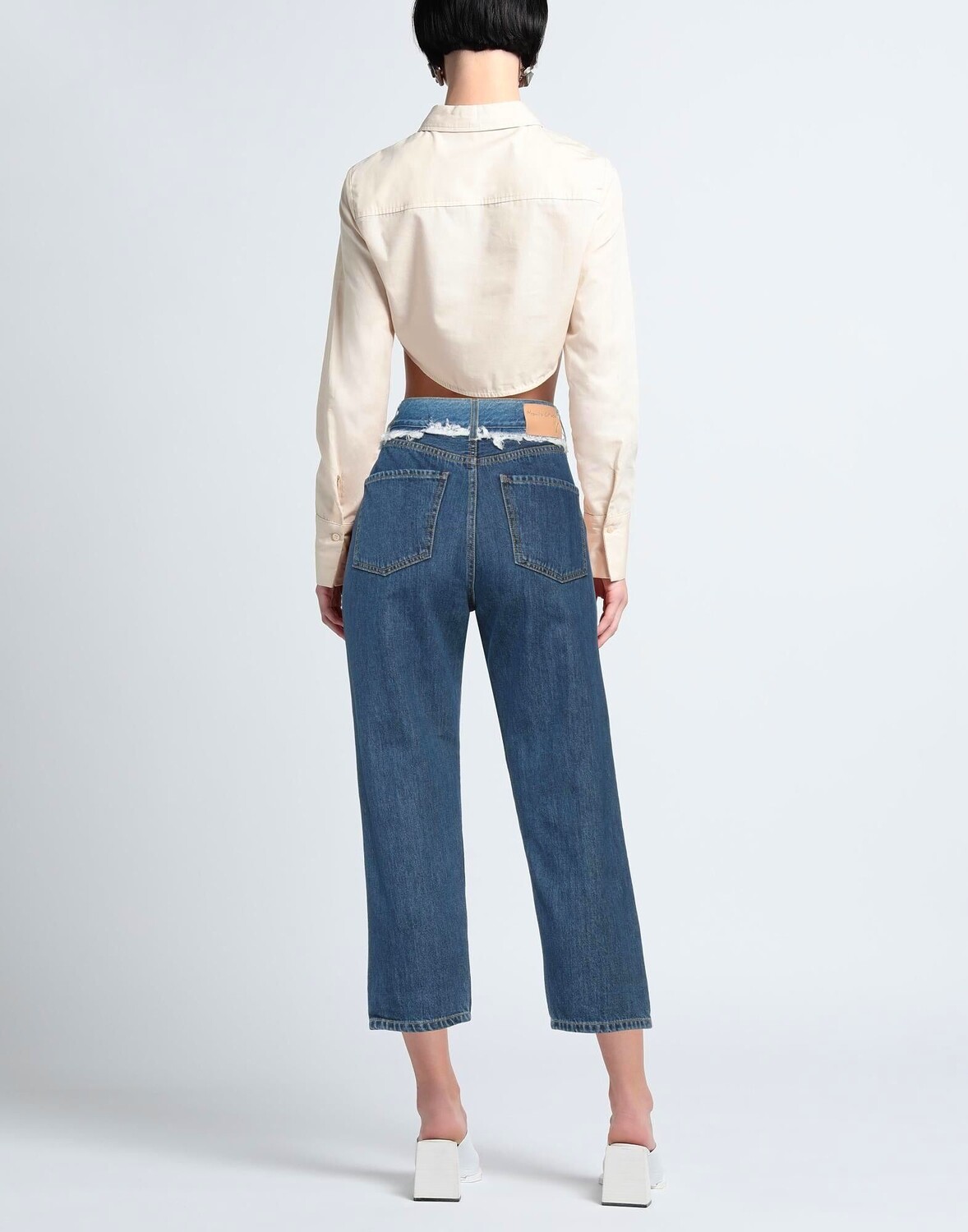Джинсовая ткань, бахрома, логотип бренда, одноцветное изделие, средняя степень стирки, завышенная талия, без подкладки, застежка-молния, 1 пуговица, пять карманов, зауженная модель