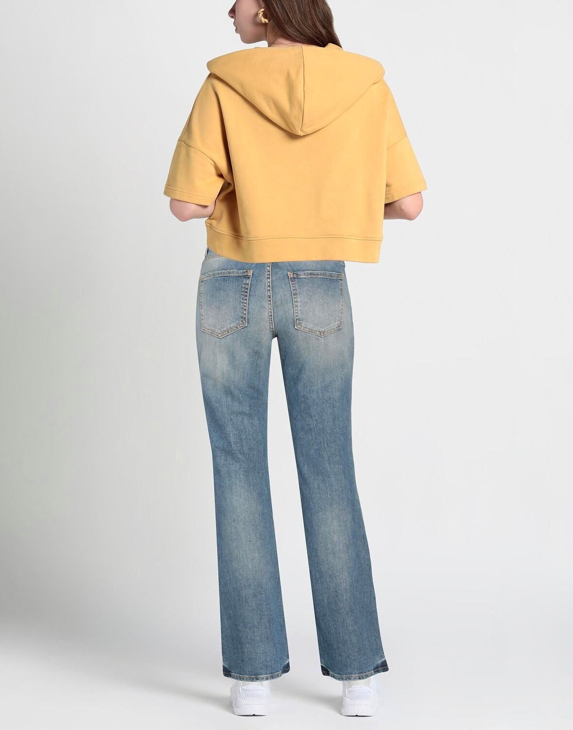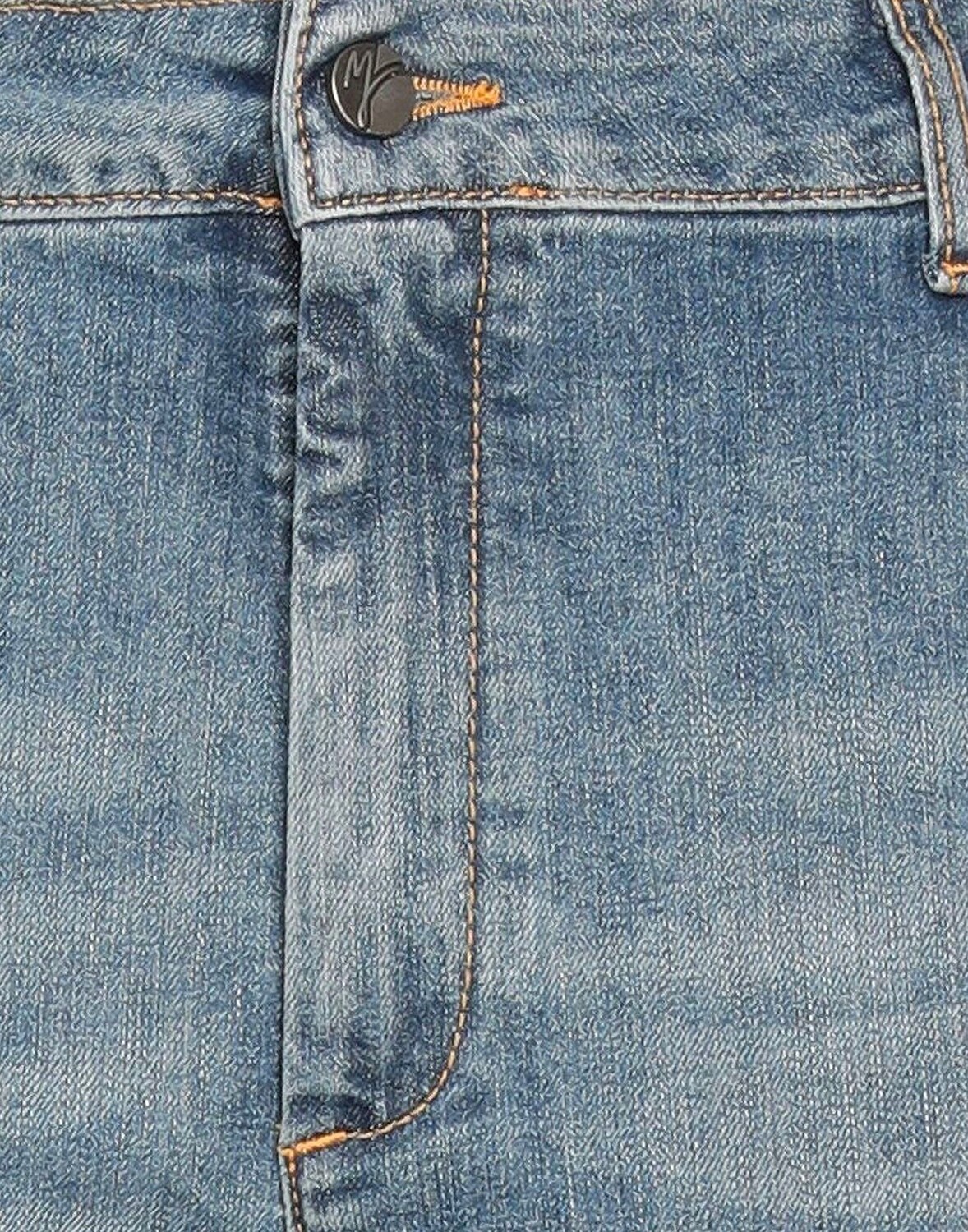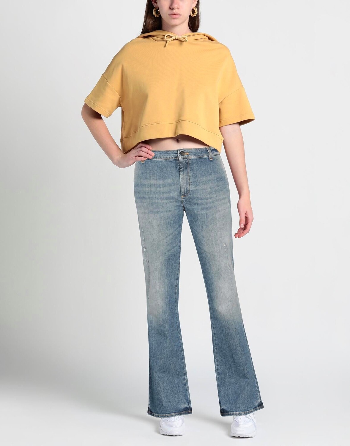 Деним, выцветший, рваная ткань, кожаные аппликации, логотип бренда, одноцветное изделие, средняя стирка, завышенная талия, шлевки для ремня, расклешенный крой, стандартный крой, застежка-молния, 1 пуговица, пять карманов, стрейч, содержит нетекстильные части животного происхождения , расклешенные и широкие брюки