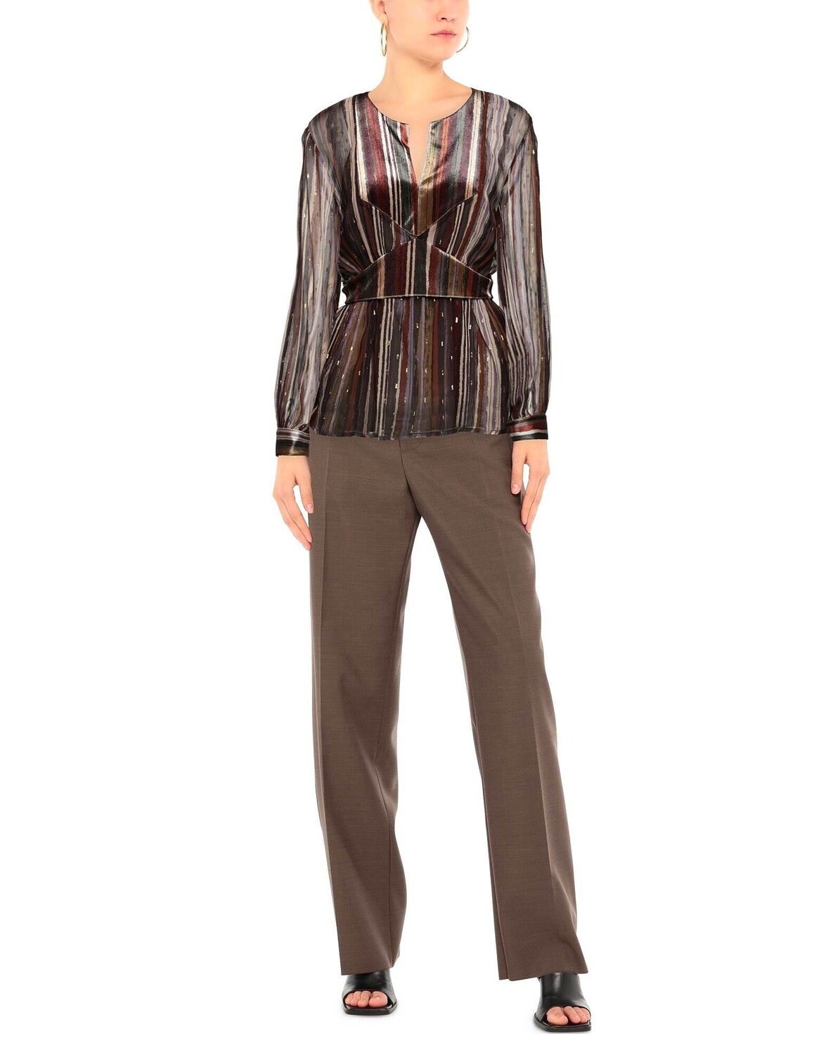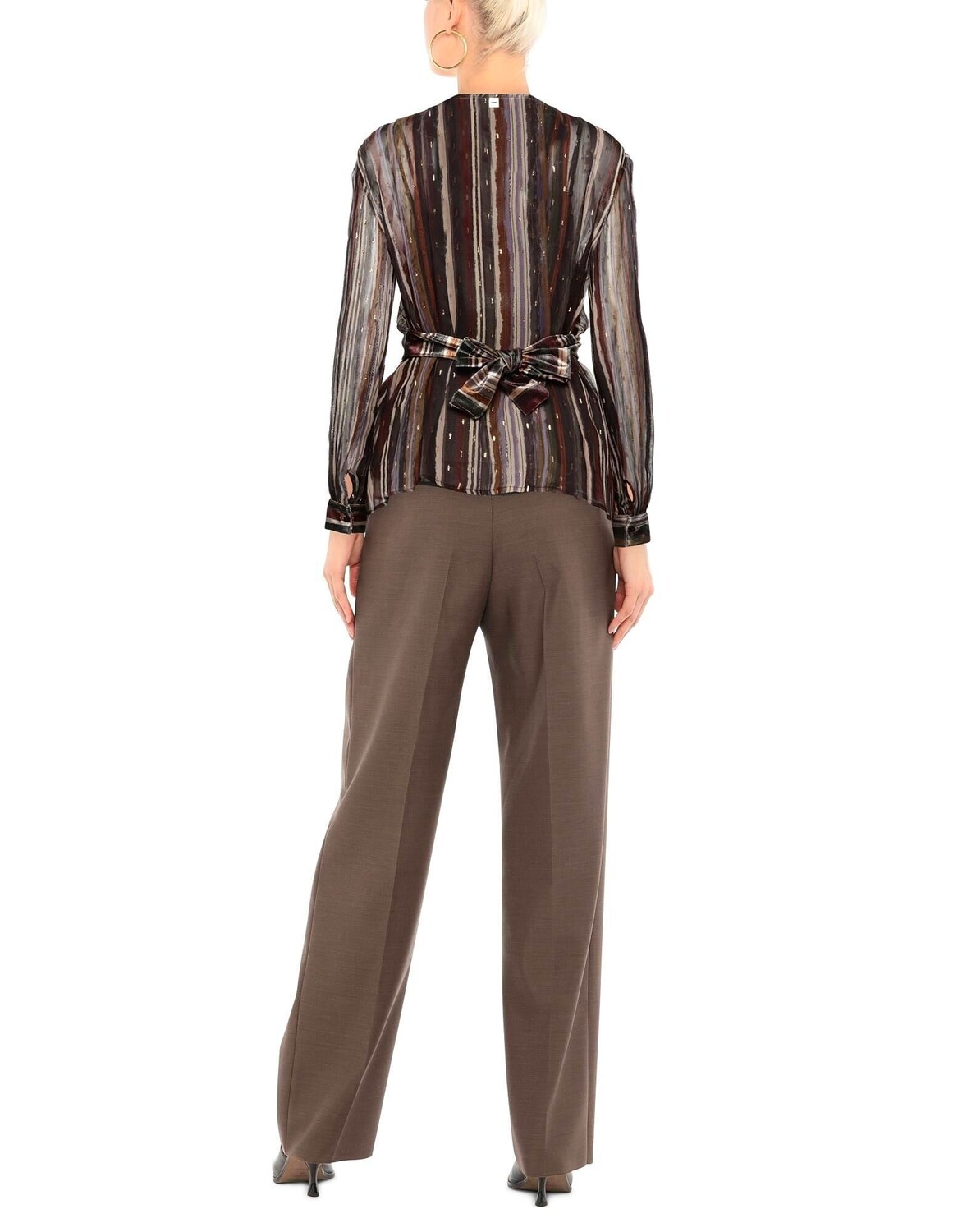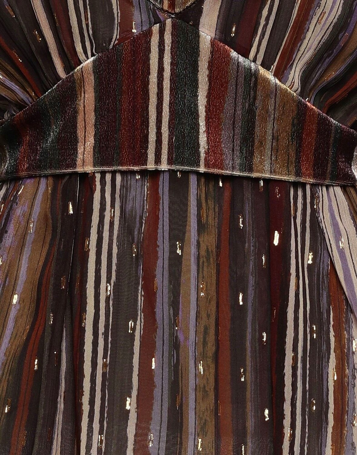 Велюр, креп, ламе, логотип бренда, пояс, полоски, глубокий вырез, длинные рукава, манжеты на пуговицах, без карманов