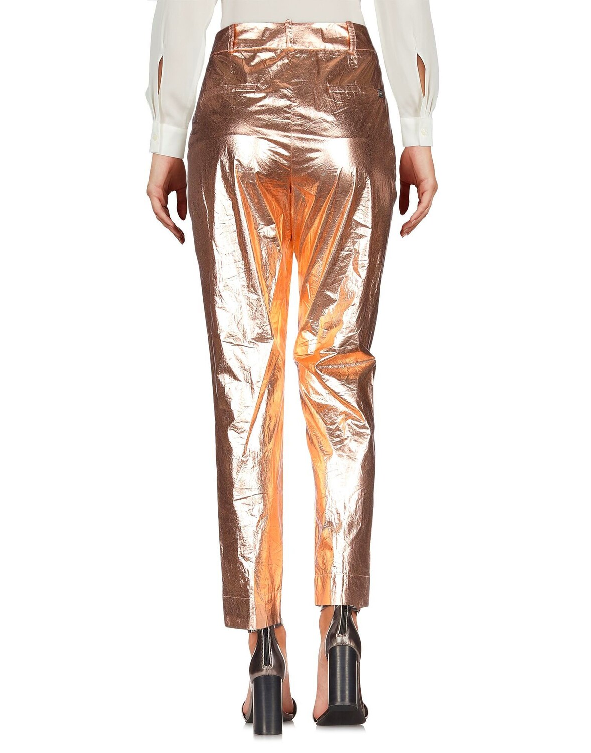 Ткань, металлик, логотип бренда, одноцветное изделие, средняя посадка, стандартная посадка, низ с боковыми разрезами, множество карманов, зауженные брюки