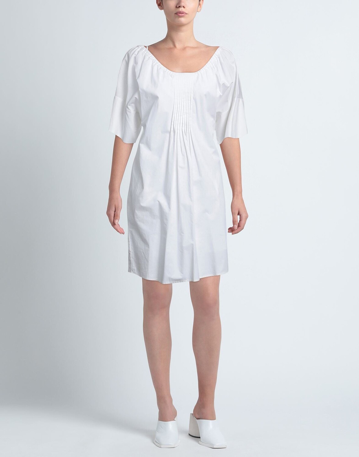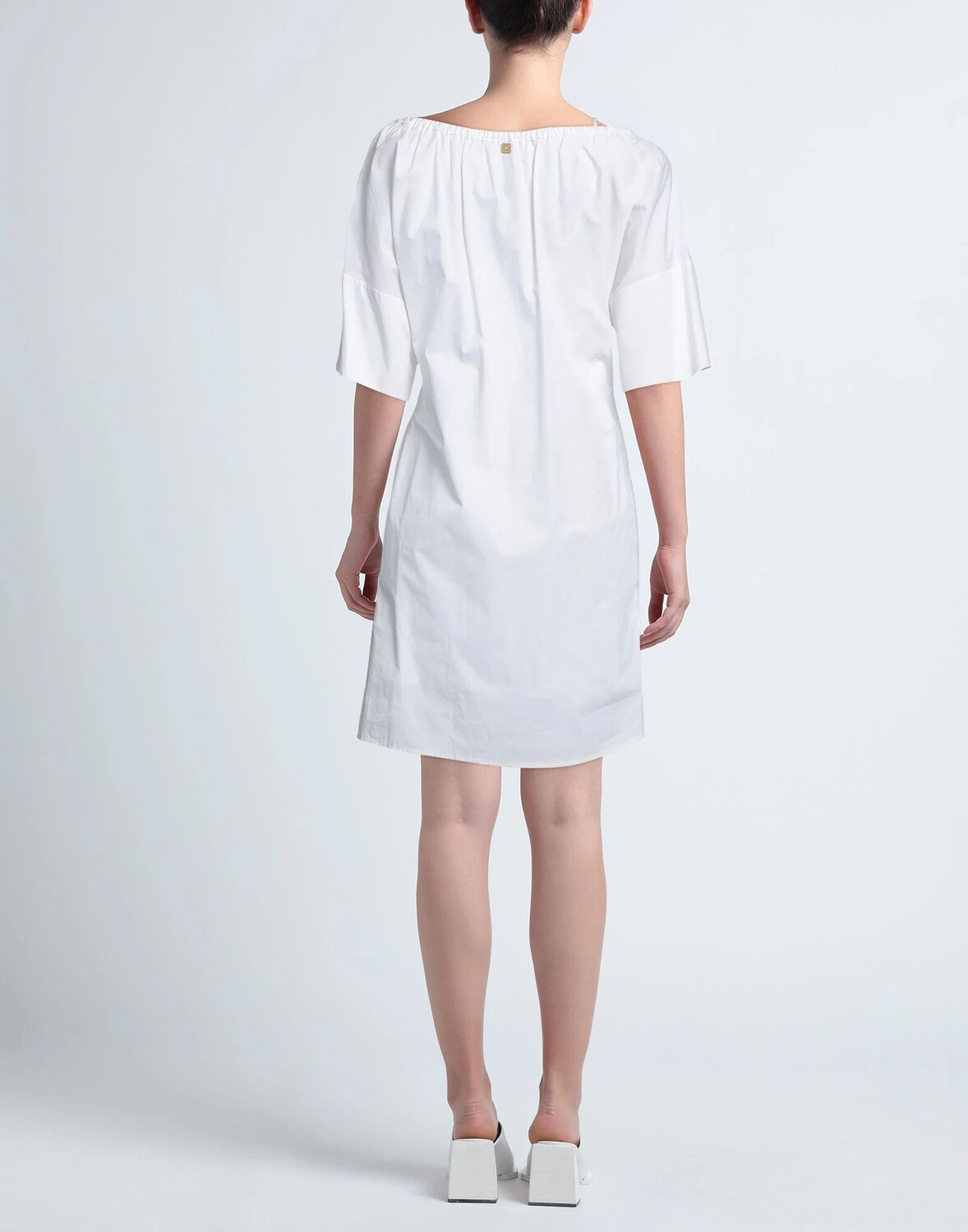 Полотняное переплетение, логотип бренда, складки, одноцветное изделие, широкий вырез горловины, короткие рукава, приталенный крой, множество карманов, платье
