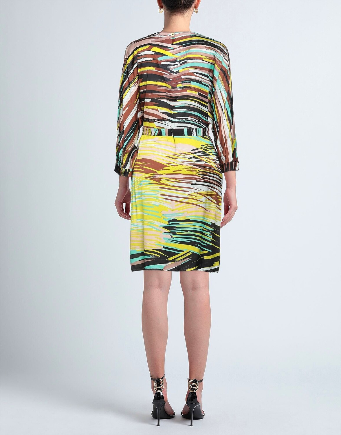 Креп, логотип бренда, разноцветный узор, v-образный вырез, короткие рукава, без подкладки, пуговицы, без карманов, платье