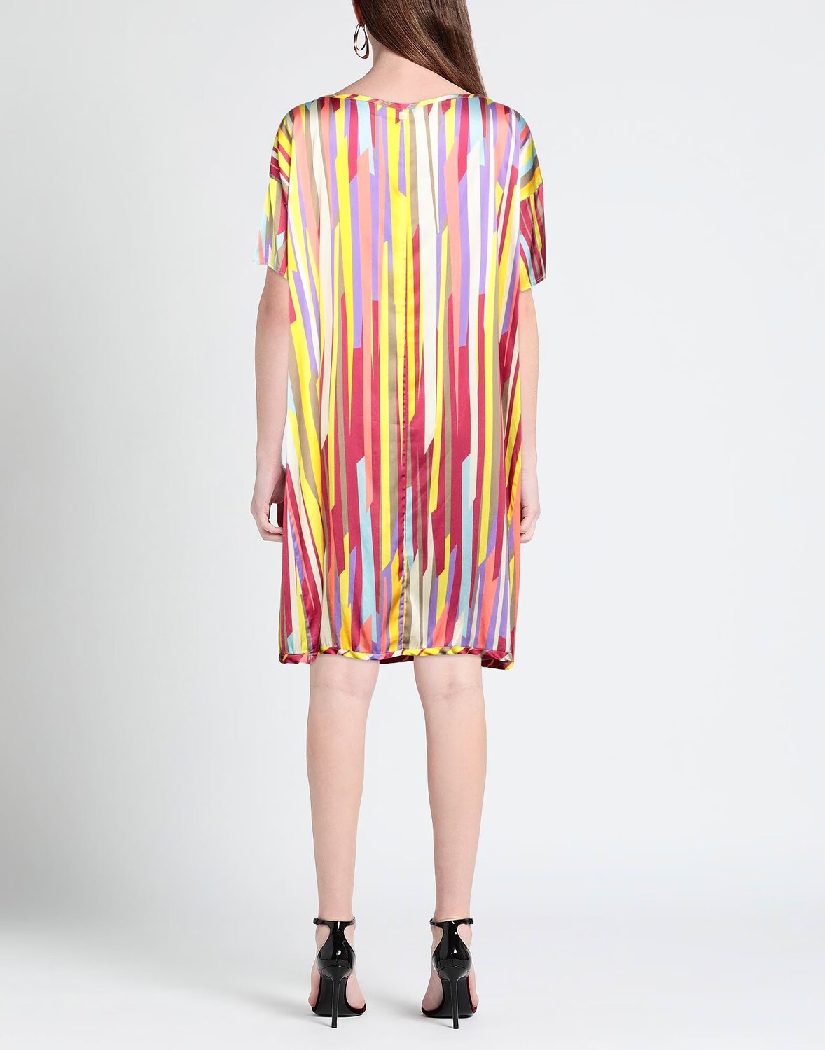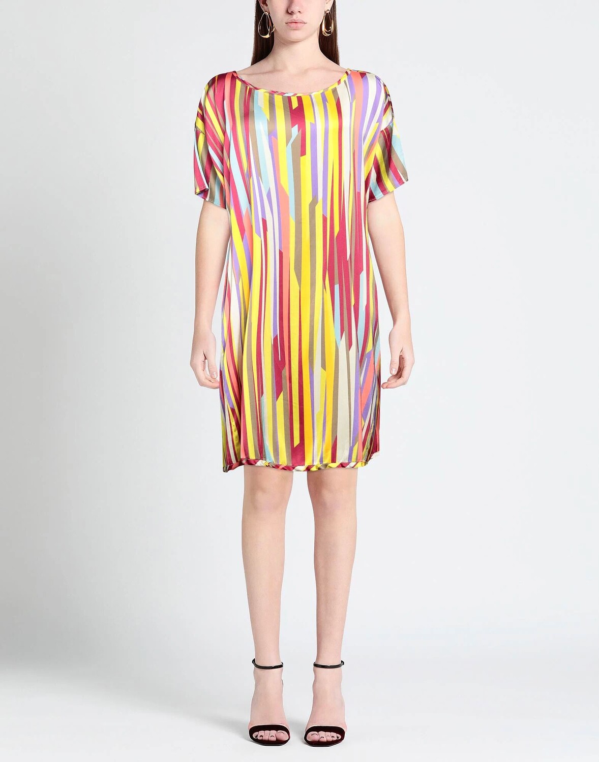 Расклешенное платье, атлас, без аппликаций, в полоску, круглый вырез, короткие рукава, без подкладки, без карманов, стрейч