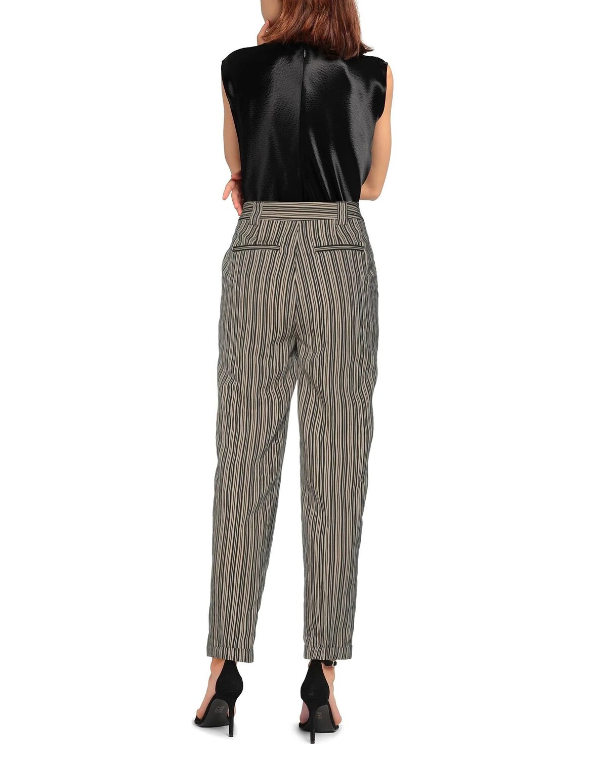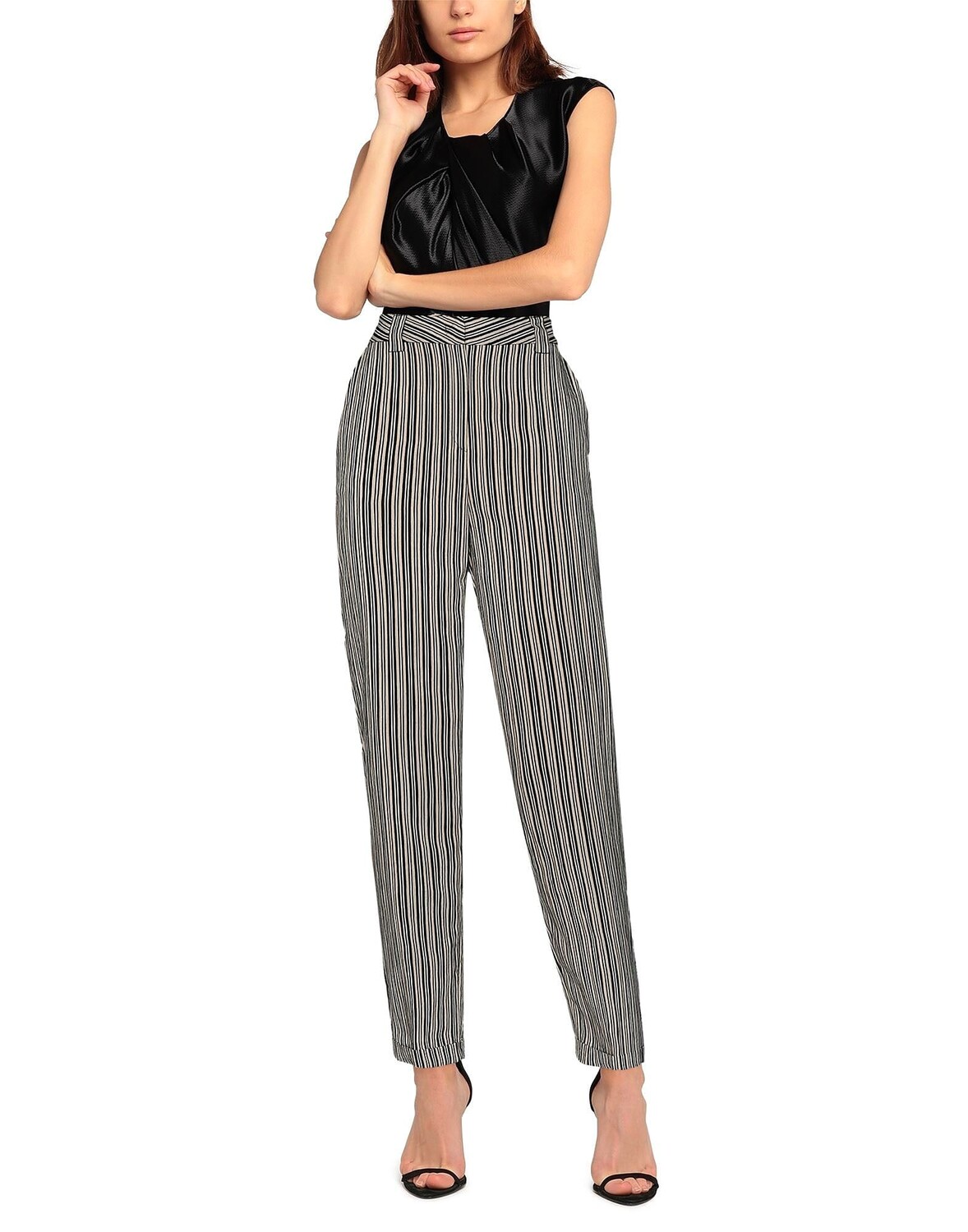 Креп, логотип бренда, полоски, завышенная талия, зауженные брючины, стандартный крой, застежка на крючки, застежка-молния, множество карманов, манжеты по краю