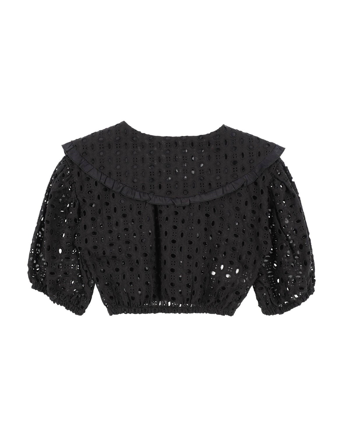 Кружево, шнурки, одноцветное изделие, классический воротник, короткие рукава, без карманов, ручная стирка, нельзя отбеливать, нельзя сушить в стиральной машине, гладить при температуре не выше 110°C.
