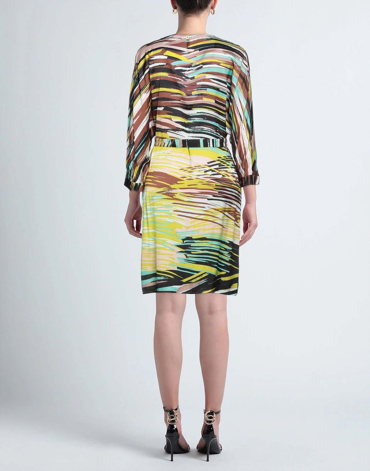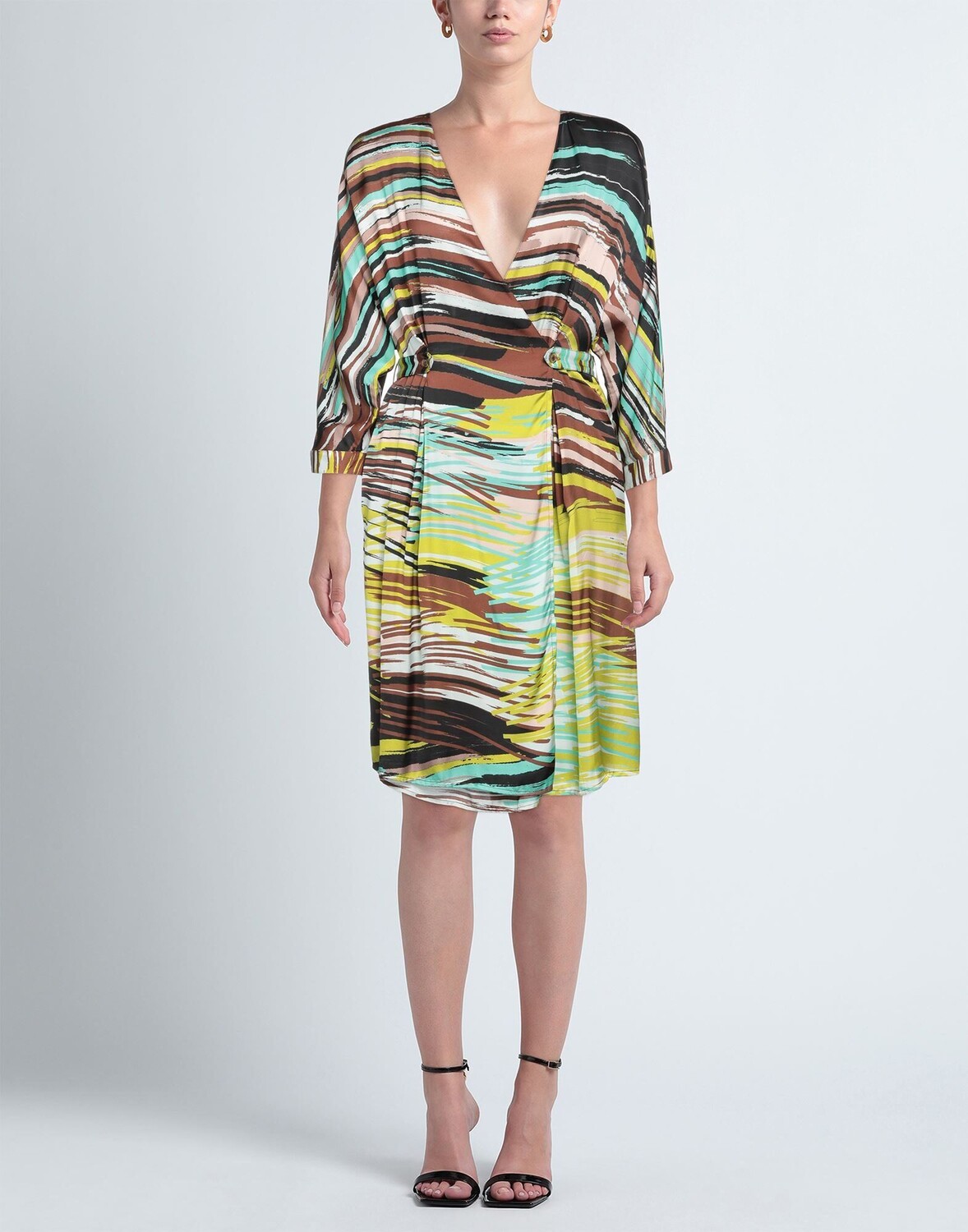 Креп, логотип бренда, разноцветный узор, v-образный вырез, короткие рукава, без подкладки, пуговицы, без карманов, платье