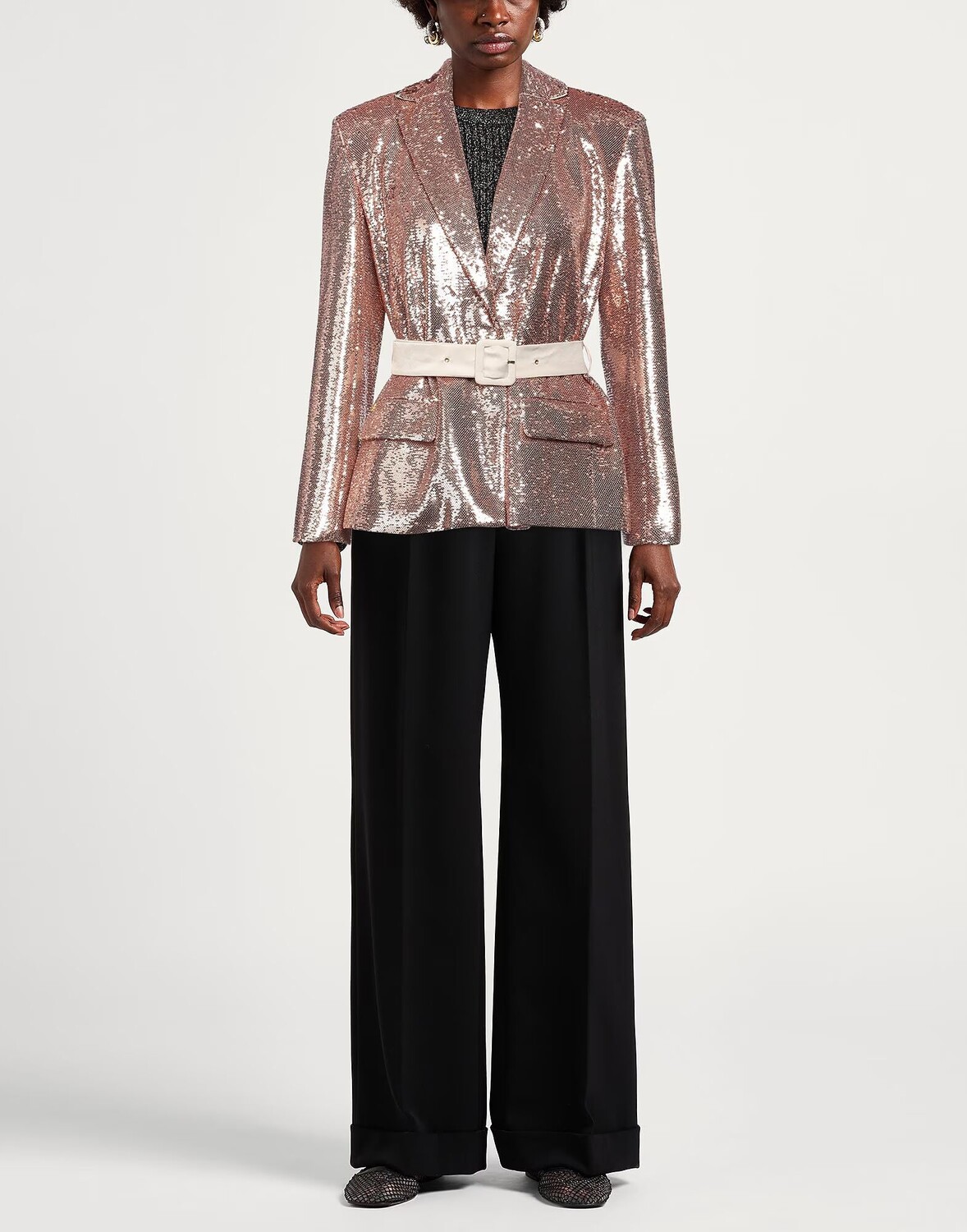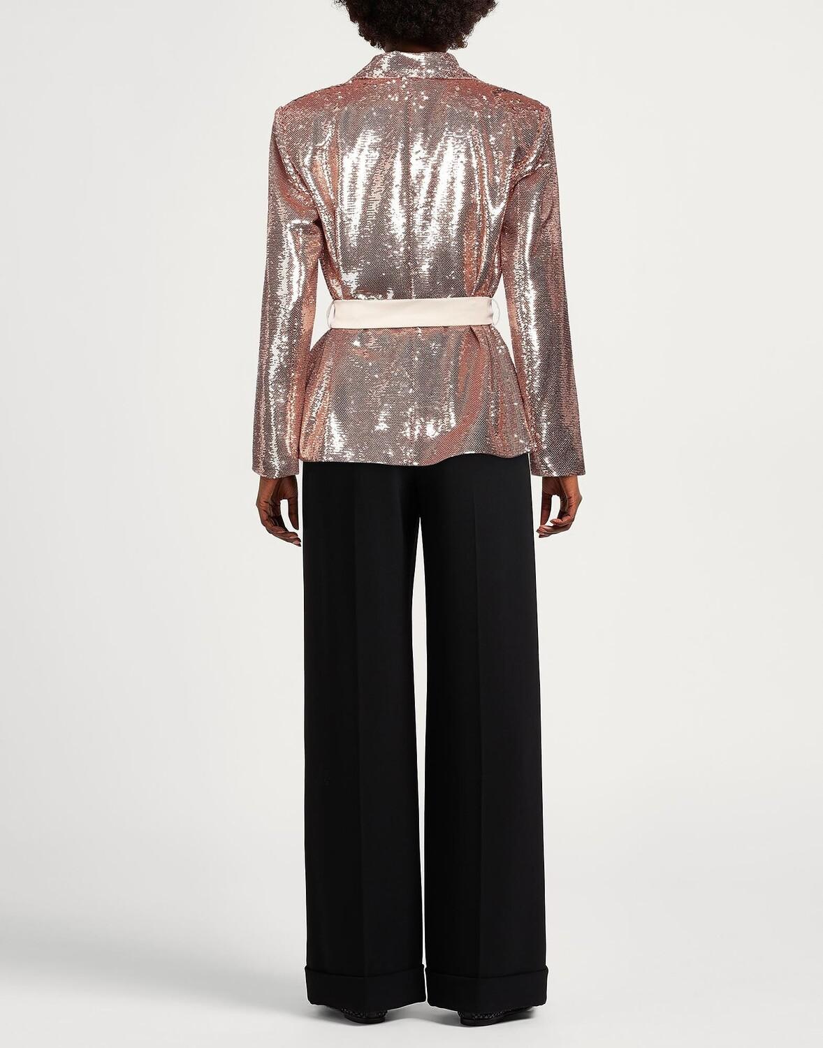 Однобортный пиджак, тюль, пайетки, логотип бренда, ремень, одноцветное изделие, воротник с лацканами, длинные рукава, внутри на подкладке, кнопки, множество карманов, ручная стирка, нельзя отбеливать, нельзя сушить в стиральной машине