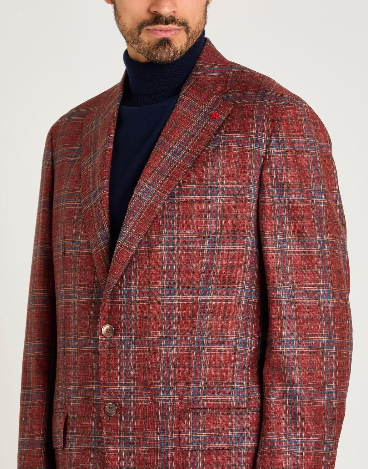 Классная шерсть, брошь, узор «тартан», воротник с лацканами, длинные рукава, подплечники, внутри на подкладке, застежка на пуговицы, множество карманов, двойные шлицы сзади, химчистка, не отбеливать, нельзя сушить в стиральной машине, однобортный пиджак