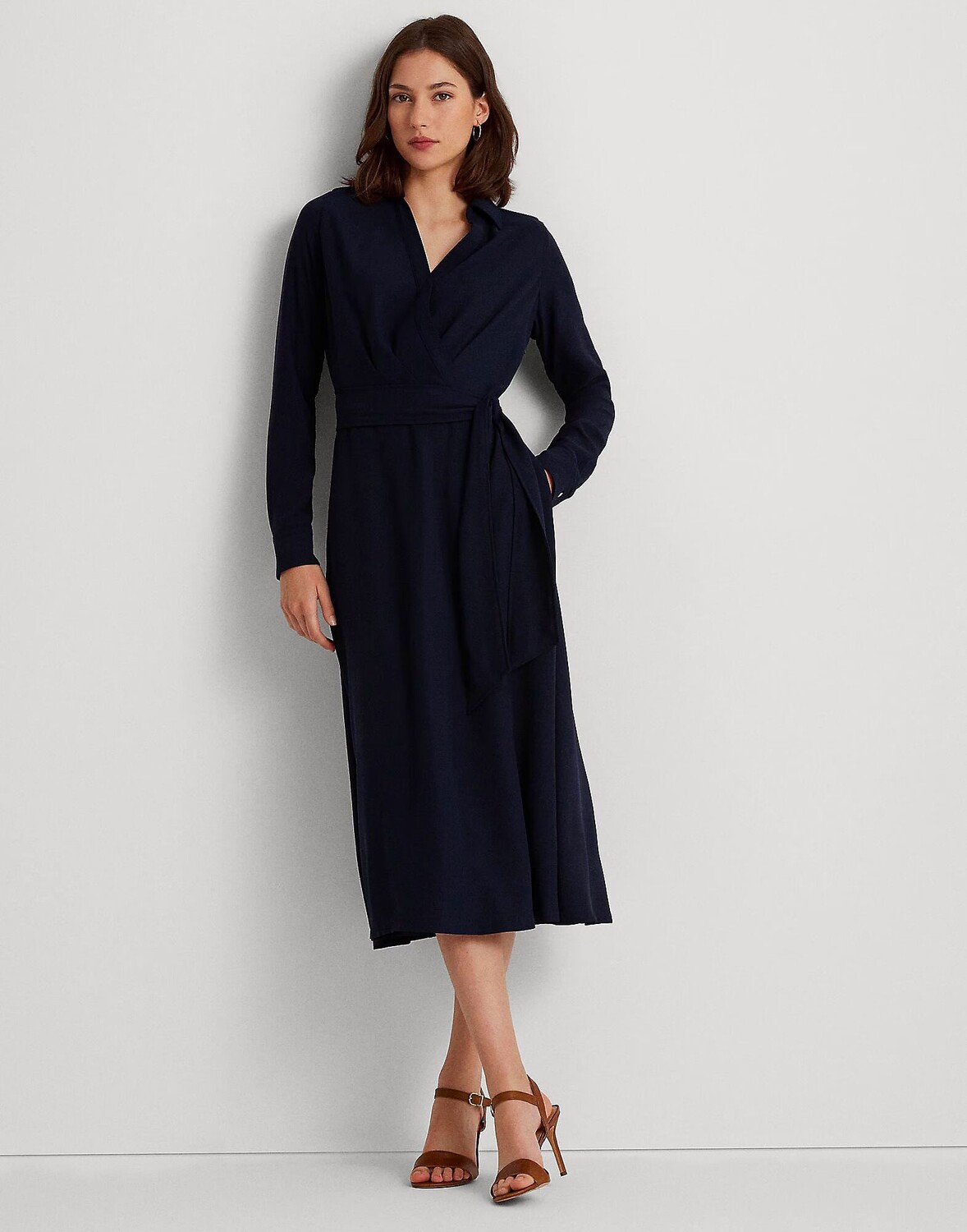 Платье с запахом, креп, однотонное изделие, плиссировка, пояс, v-образный вырез, длинные рукава, манжеты на пуговицах, без подкладки, застежка-молния, машинная стирка или химчистка, не отбеливать, сушить в стиральной машине, тираж этой марки велик