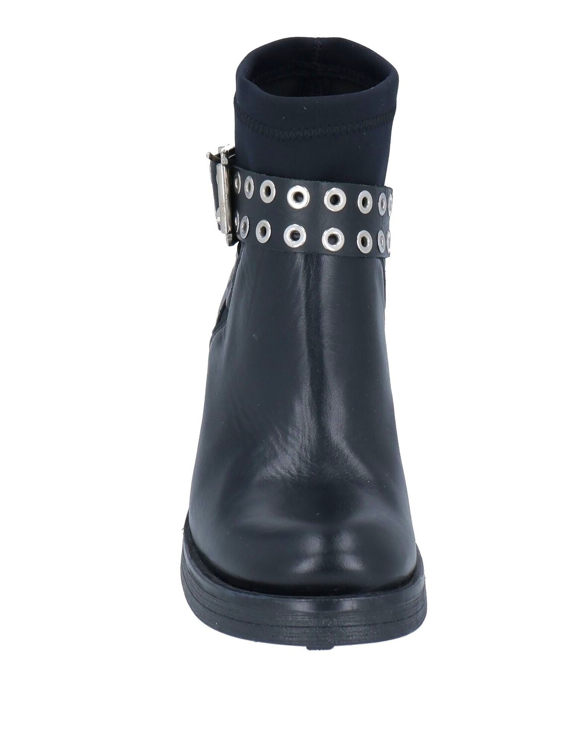 Кожа, техническая ткань, пряжка, одноцветное изделие с аппликациями, кожаная подкладка, скругленный носок, квадратный каблук, подошва с ушками, содержит нетекстильные части животного происхождения, модель байкерских ботинок