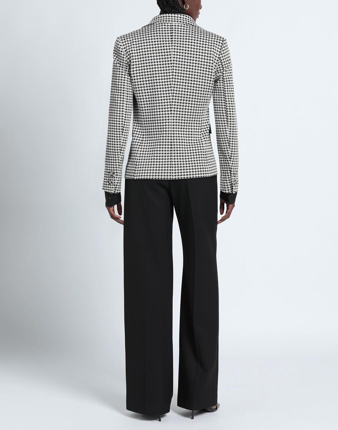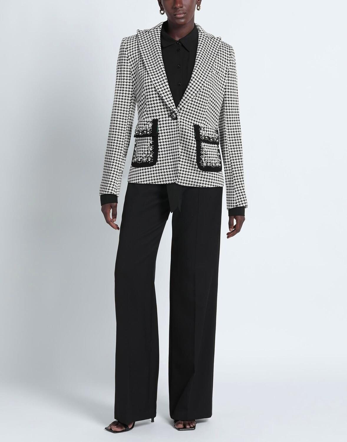 Джерси, стразы, узор «гусиные лапки», воротник с лацканами, однобортный, длинные рукава, манжеты на пуговицах, внутри на подкладке, 1 пуговица, множество карманов, стрейч, однобортный пиджак