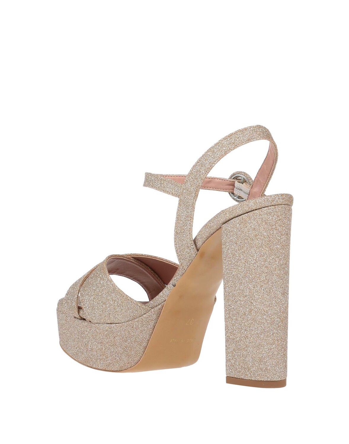 Синтетическое волокно, блестки, одноцветное изделие, внутренняя часть из ткани, эластичные вставки, застежка-бретелька, скругленный носок, квадратный каблук, обтянутый каблук, кожаная подошва, содержит нетекстильные части животного происхождения, сандалии с ремешком на щиколотке