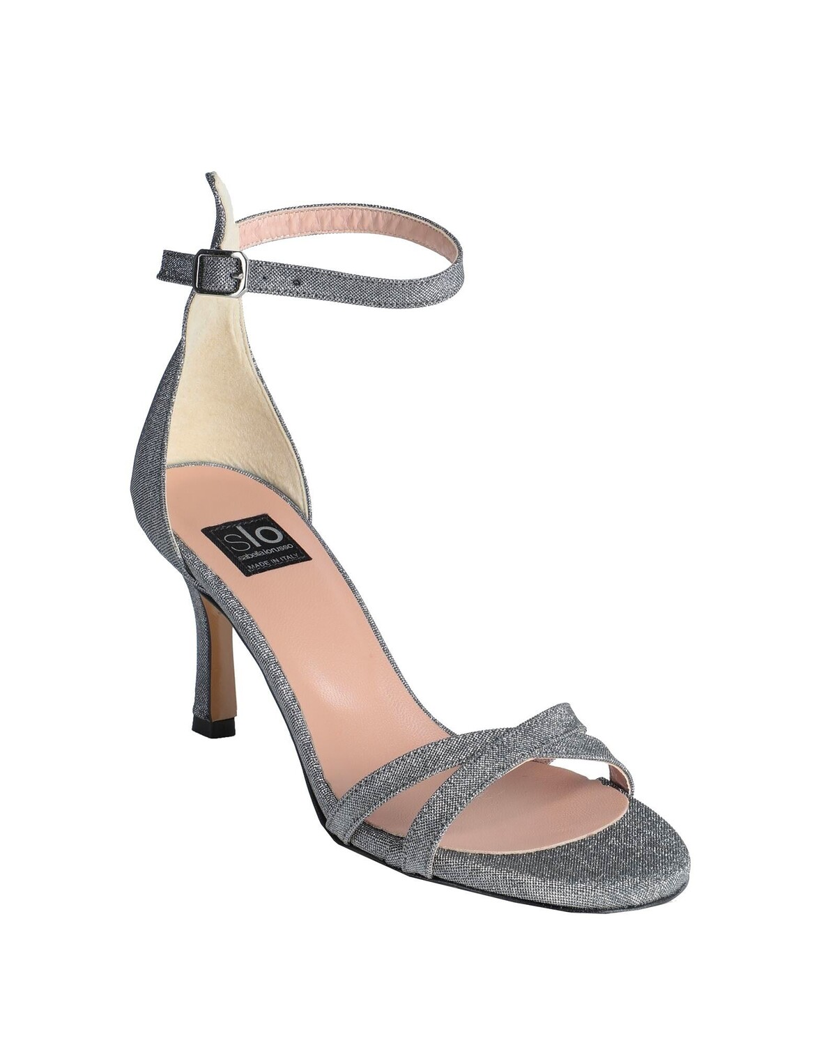 Ламе, без аппликаций, одноцветное изделие, на подкладке, ремешок на щиколотке с пряжкой, круглый носок, каблук-щипок, кожаная подошва, содержит нетекстильные части животного происхождения, босоножки с ремешком на щиколотке