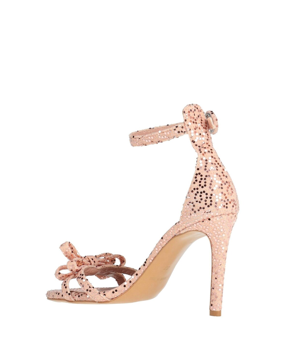 Полотняное переплетение, пайетки, бант, одноцветное изделие с аппликациями, кожаная подкладка, застежка-бретелька, скругленный носок, каблук-шпилька, обтянутый каблук, кожаная подошва, содержит нетекстильные части животного происхождения, сандалии с ремешком на щиколотке