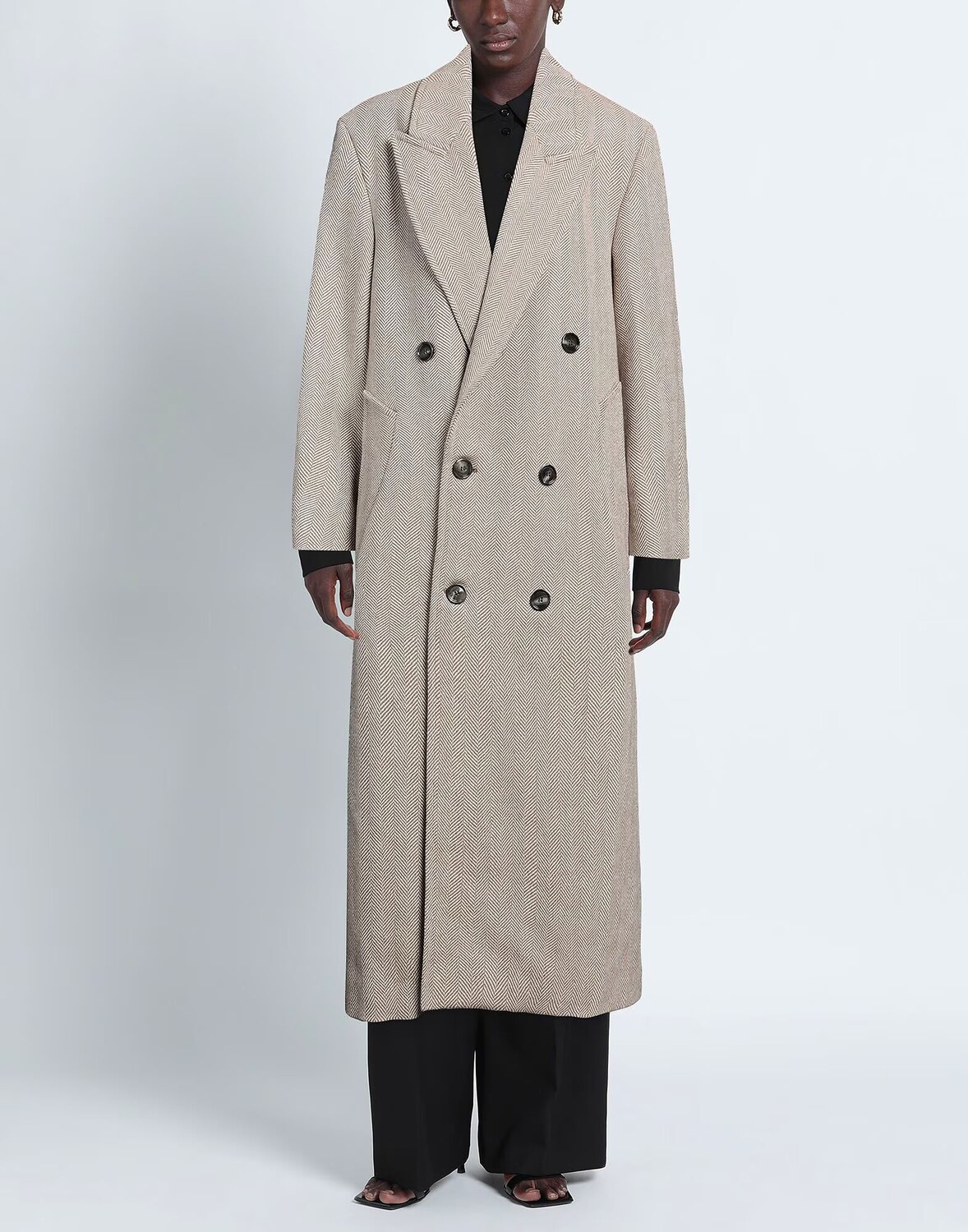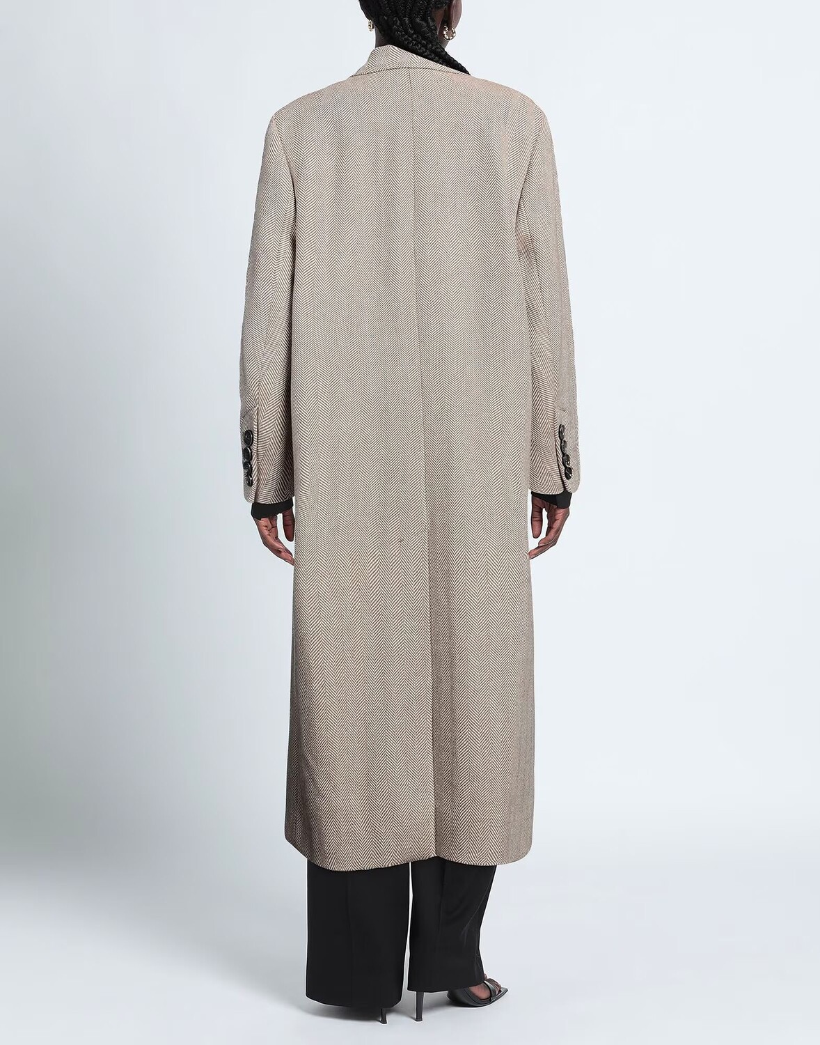 Фланель, без аппликаций, узор «елочка», воротник с лацканами, длинные рукава, без подкладки, застежка на пуговицы, множество карманов, химчистка, не отбеливать, нельзя сушить в стиральной машине, двубортное пальто