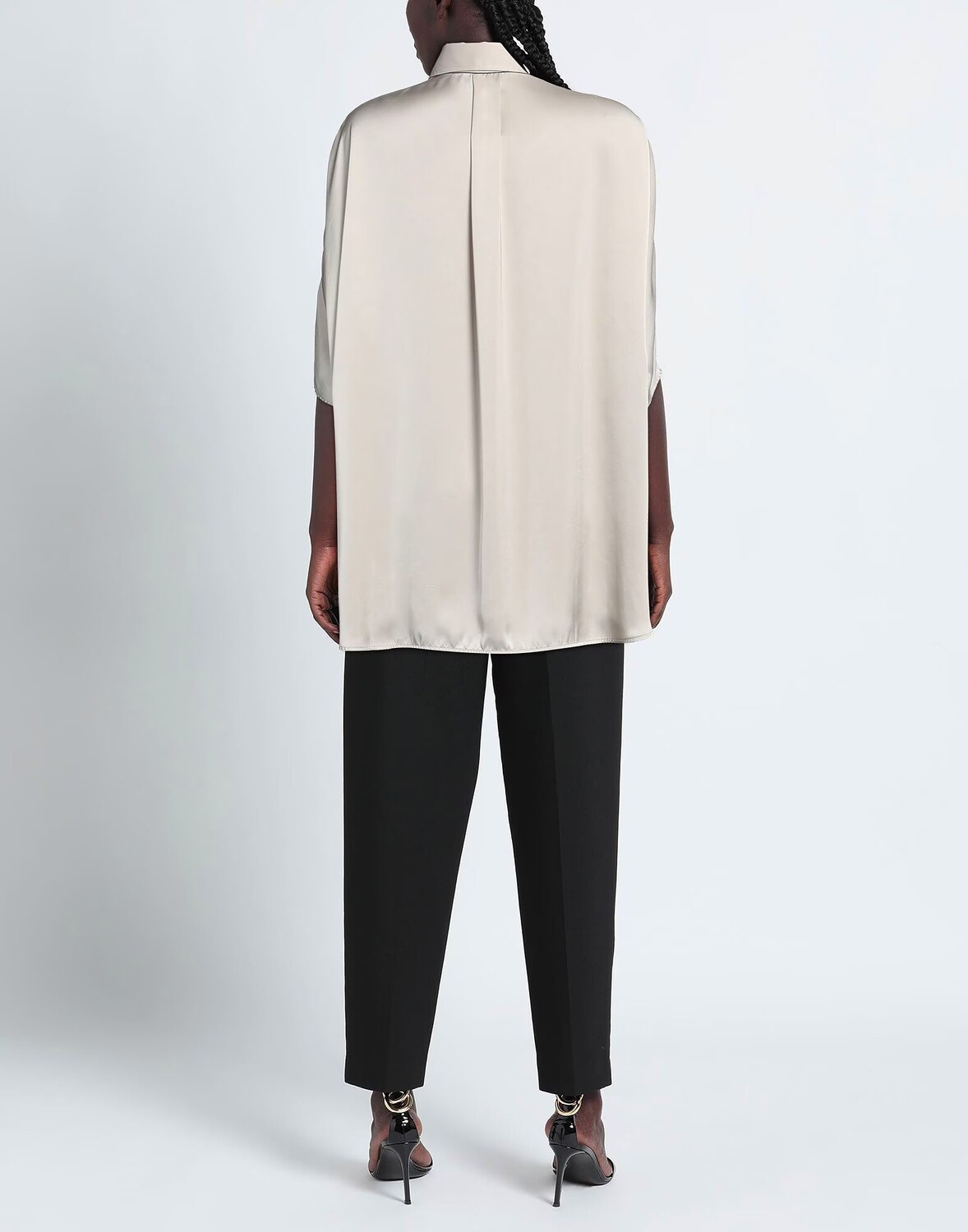 Атлас, металлические аппликации, одноцветное изделие, классический воротник, короткие рукава, потайные пуговицы, боковой разрез по низу, рубашка оверсайз